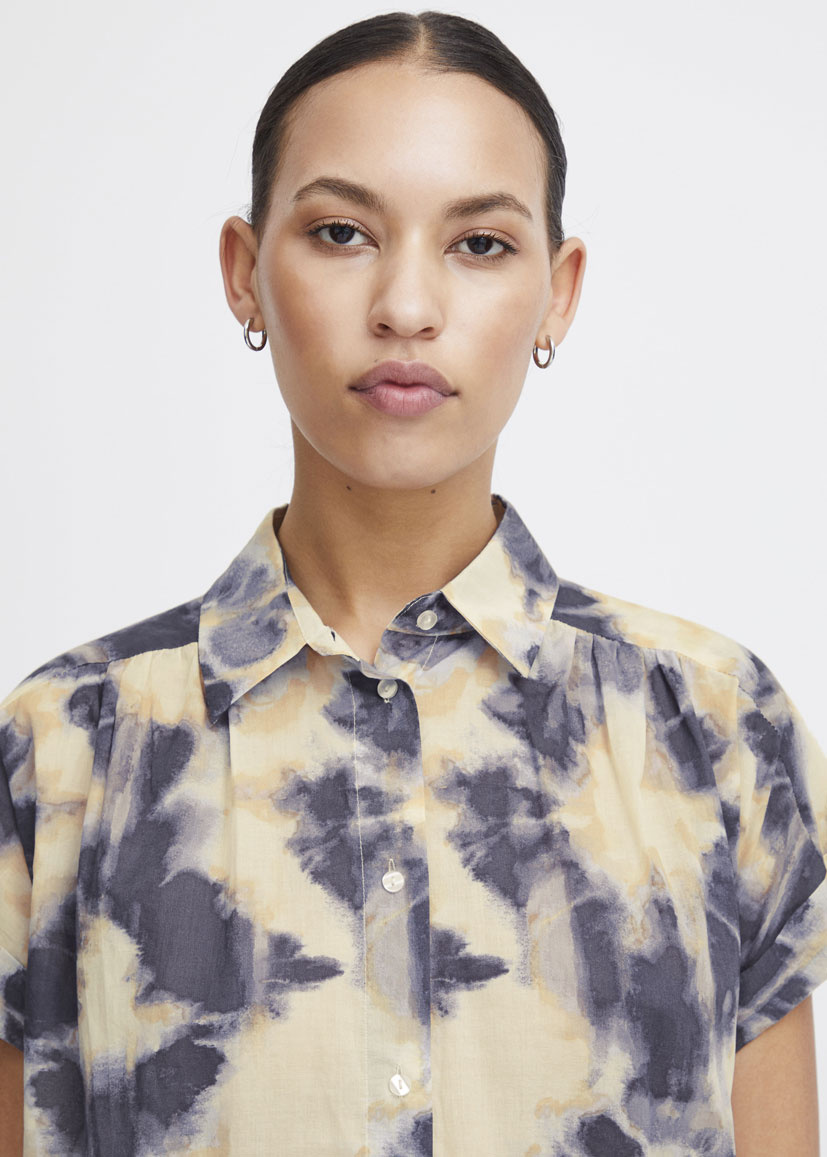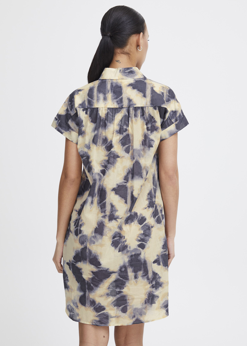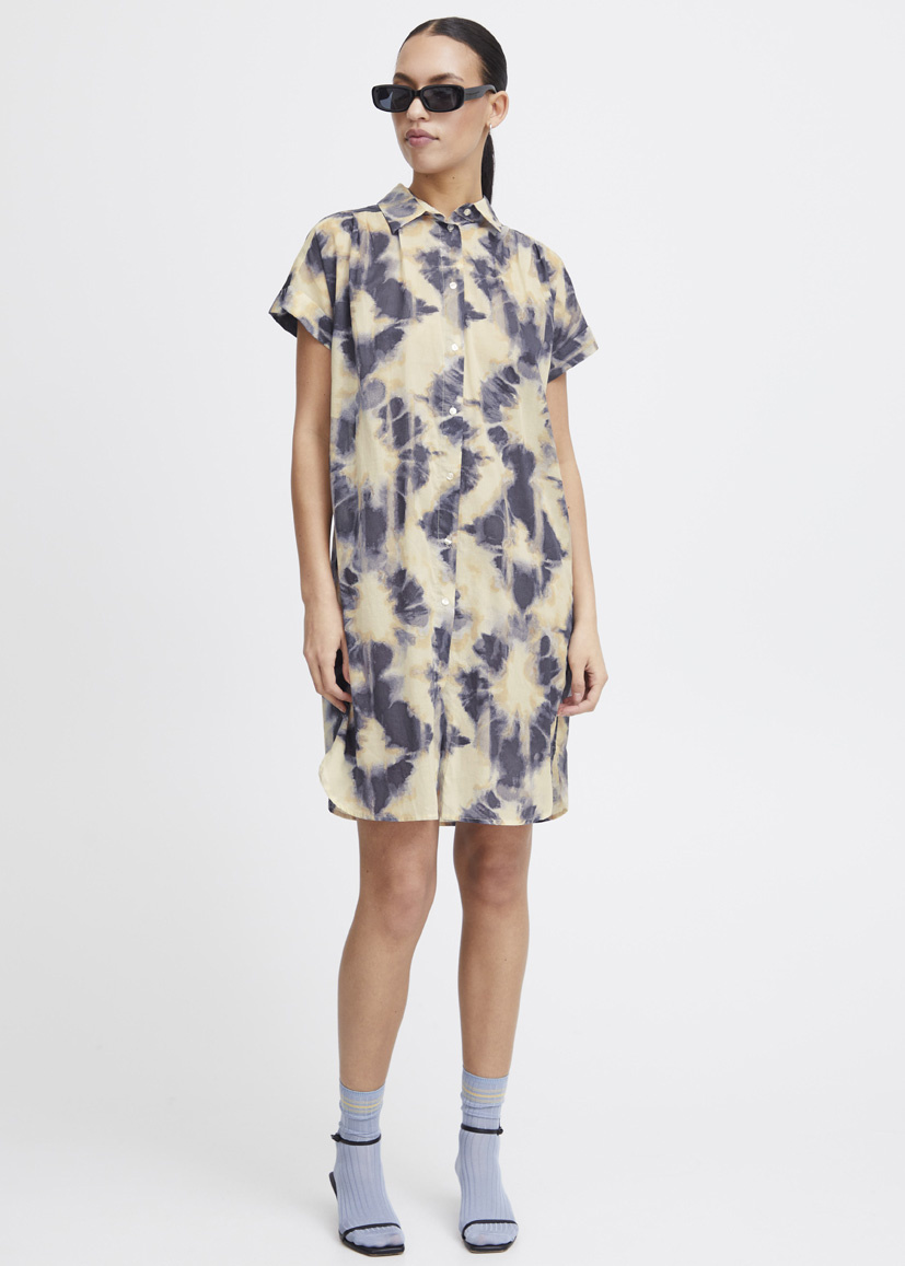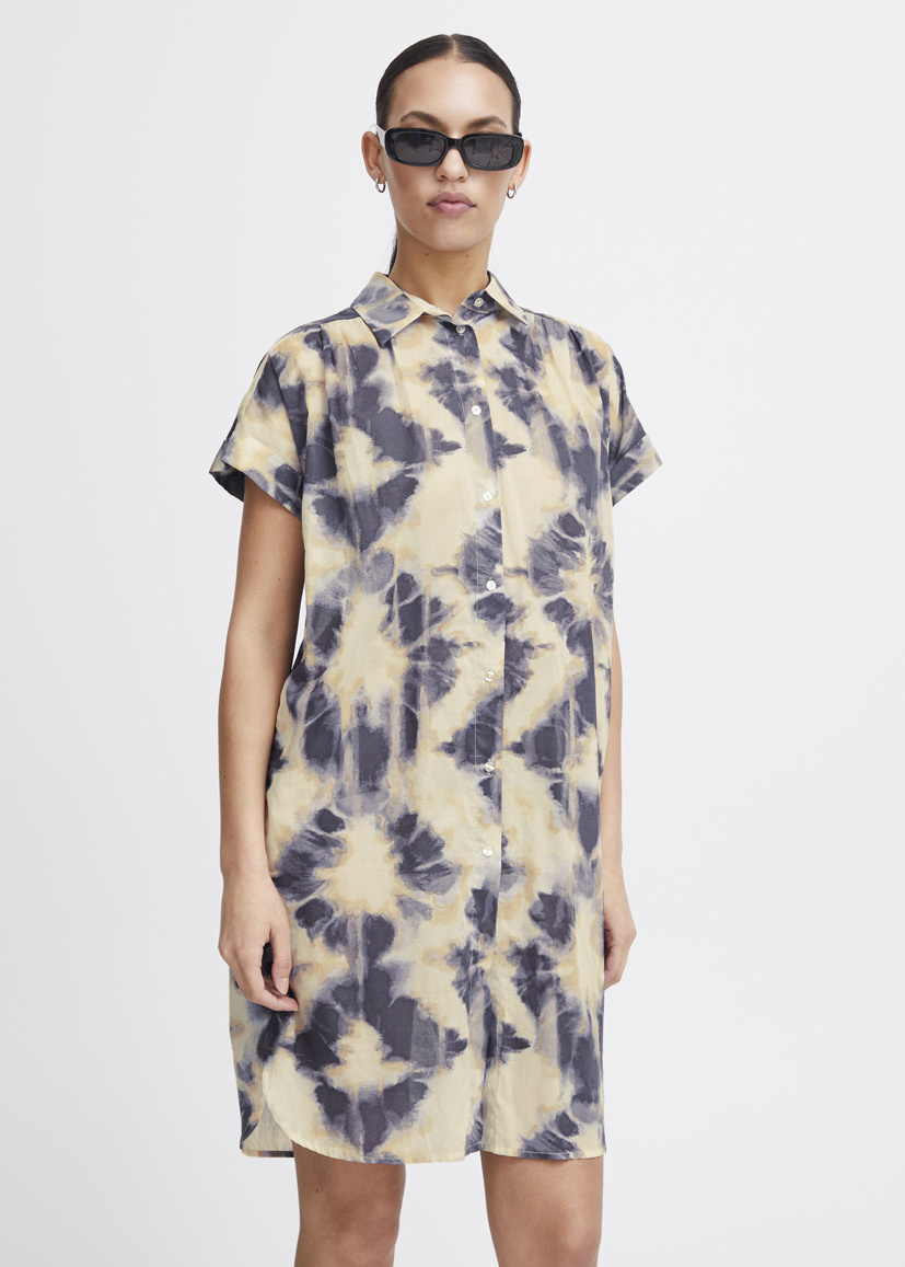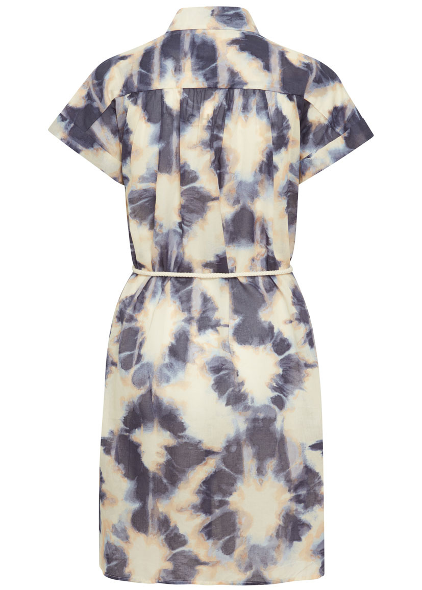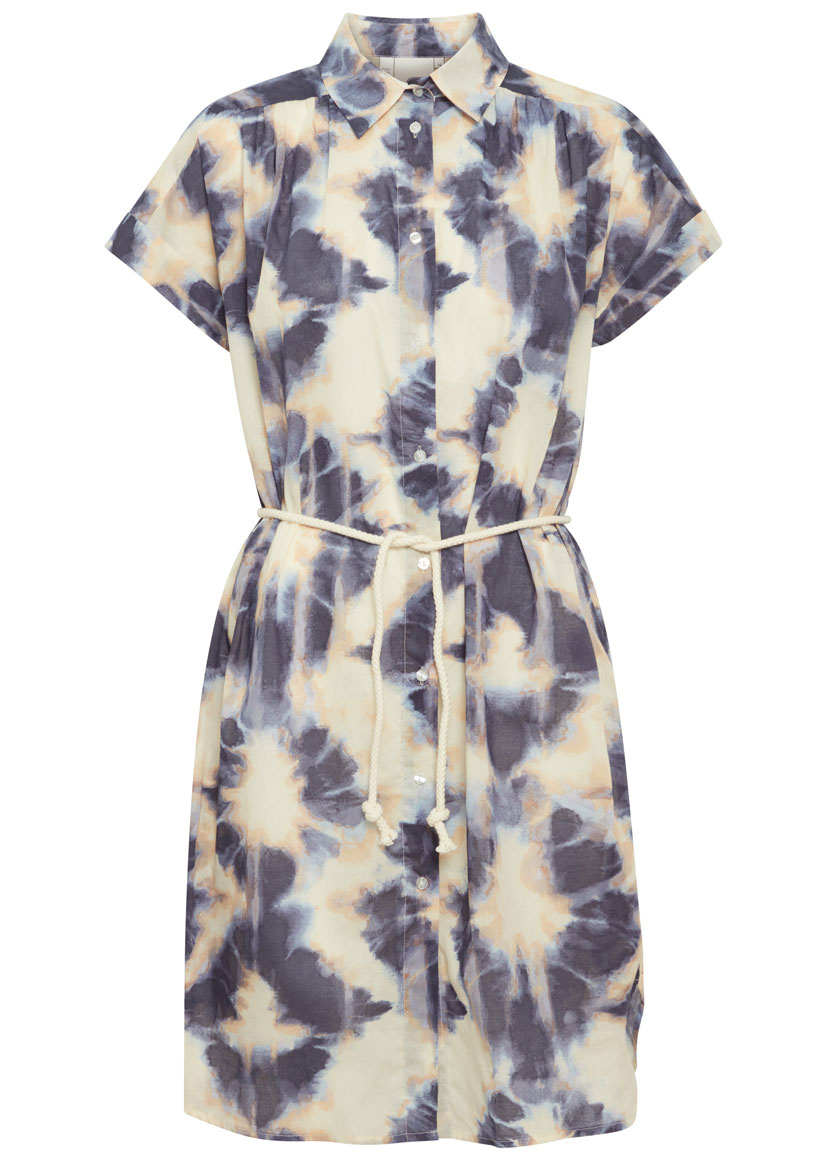 Jurk 20120941 van Ichi. De jurk heeft een allover print in de kleur blue tie dye en is gemaakt van 100% Polyester. De jurk met korte mouwen heeft ceintuur om de taille en een regular fit pasvorm.