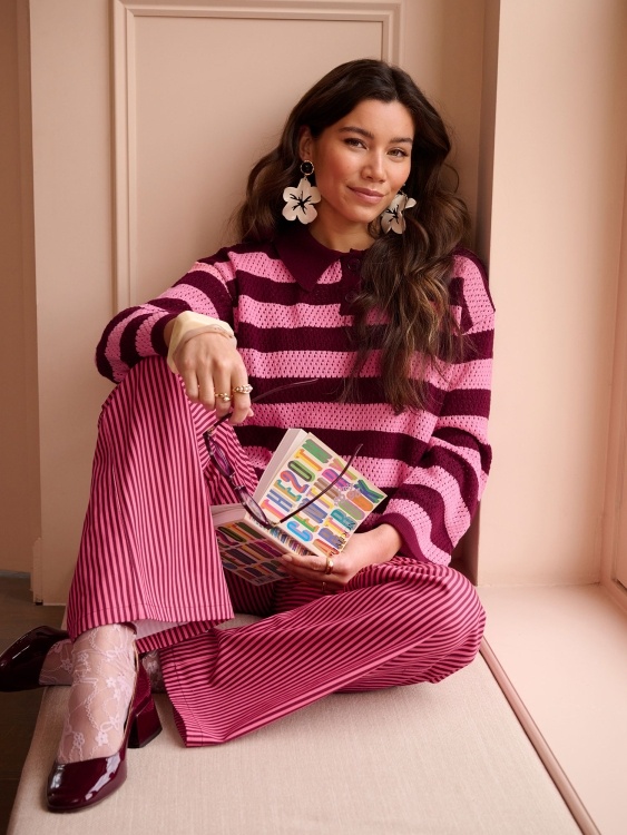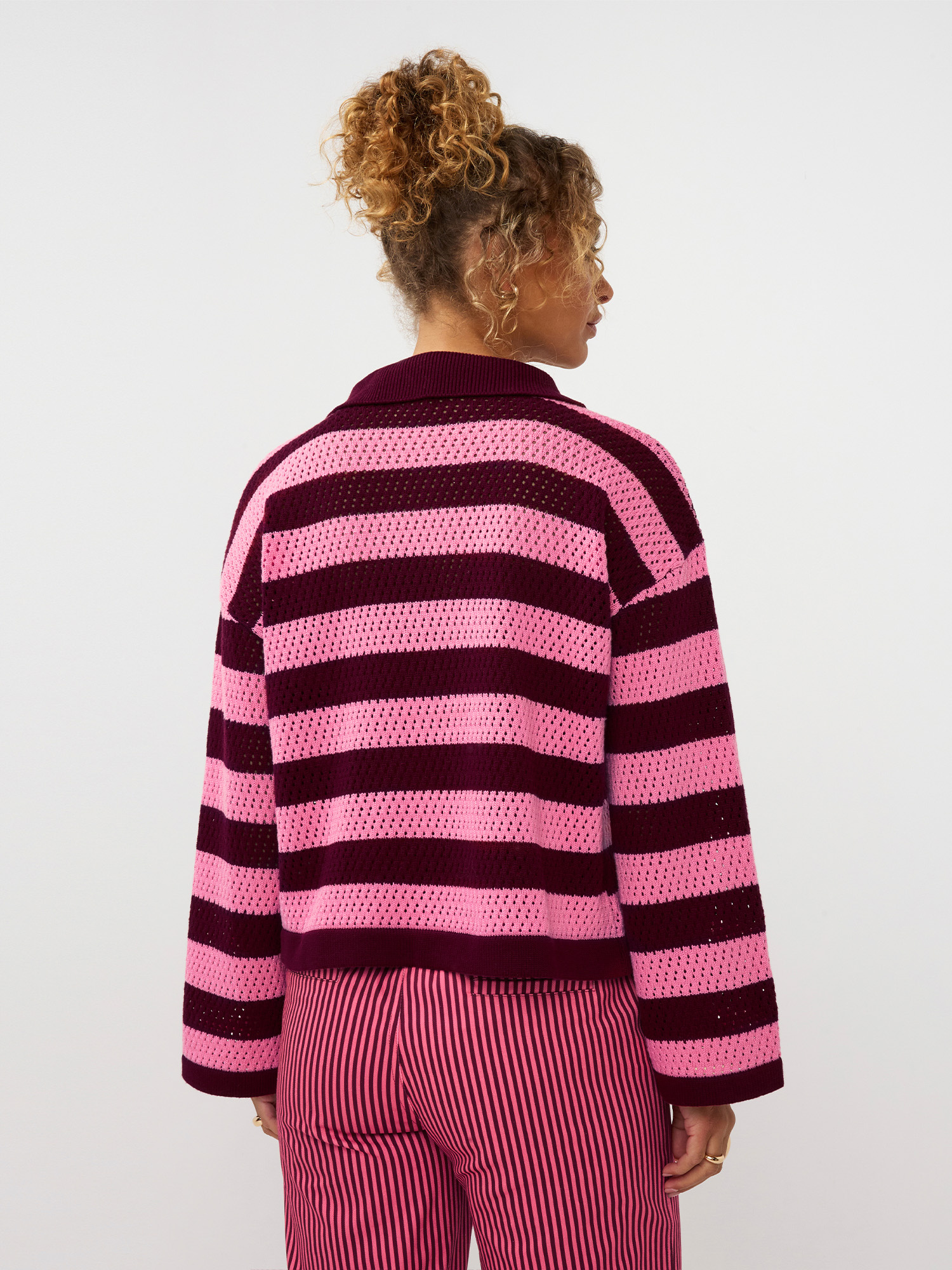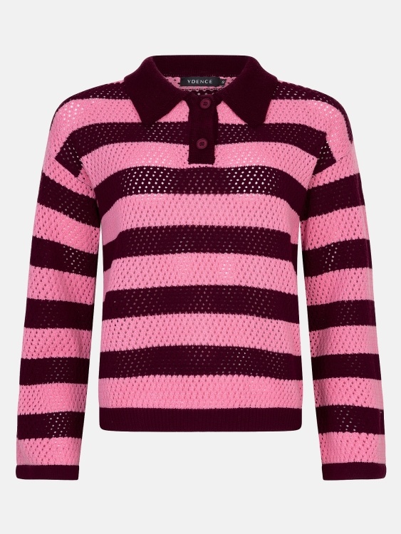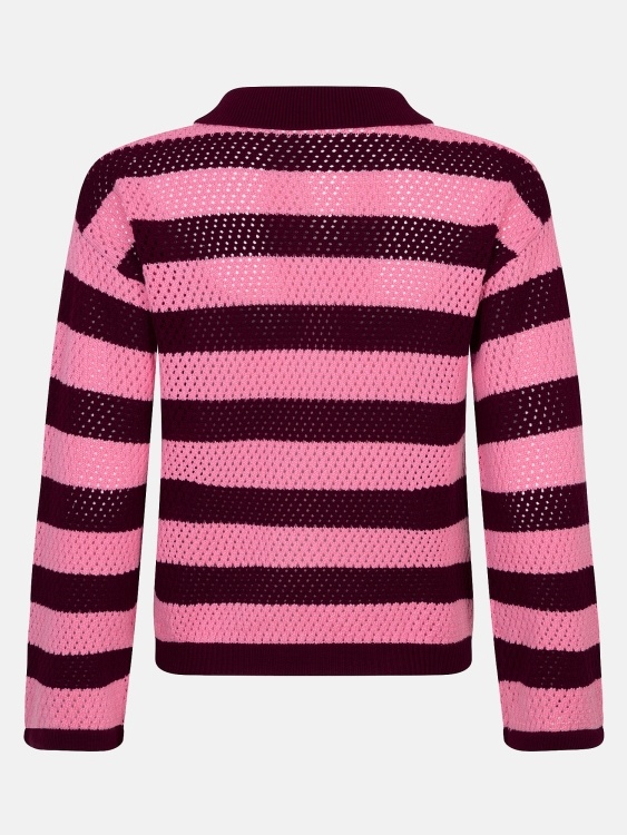 Knitted top Agnes is een knitted sweater met strepen en een echte eyecatcher dankzij de frisse kleurencombinatie en het speelse design. De polo-kraag met knoopsluiting geeft de trui een vrouwelijke maar ook stoere touch, terwijl het opengebreide patroon zorgt voor een luchtige, comfortabele feel. De totale lengte van Knitted top Agnes is 57 cm met een mouwlengte van 48 cm bij een maat S.