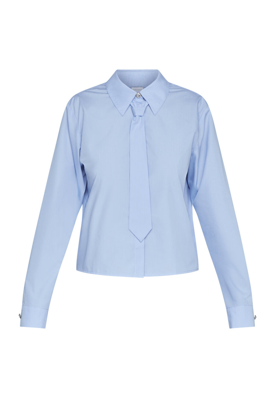 EMINA-SH is a shirt that has a classic collar and long sleeves with embellished cufflinks. It includes a tied and removable tie for a sophisticated look. The model is wearing a size S.
