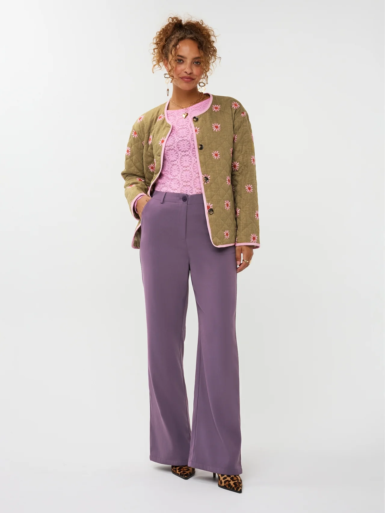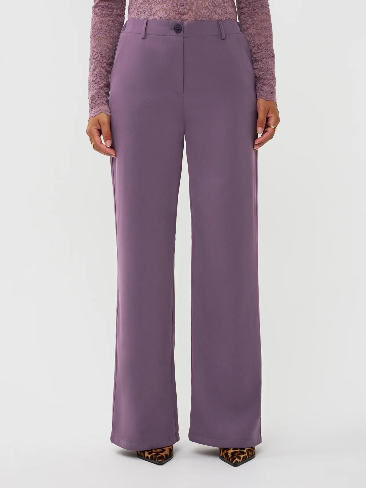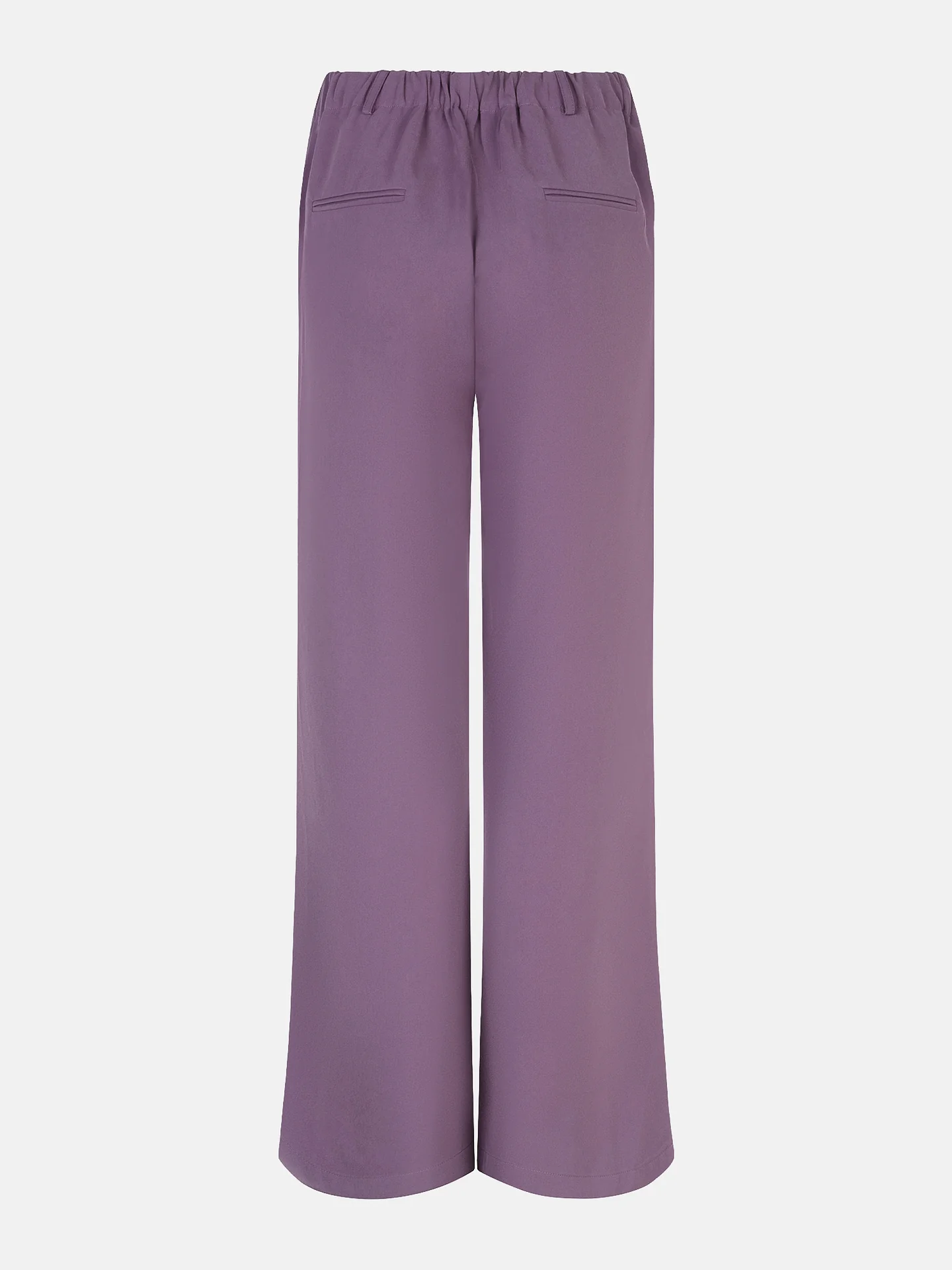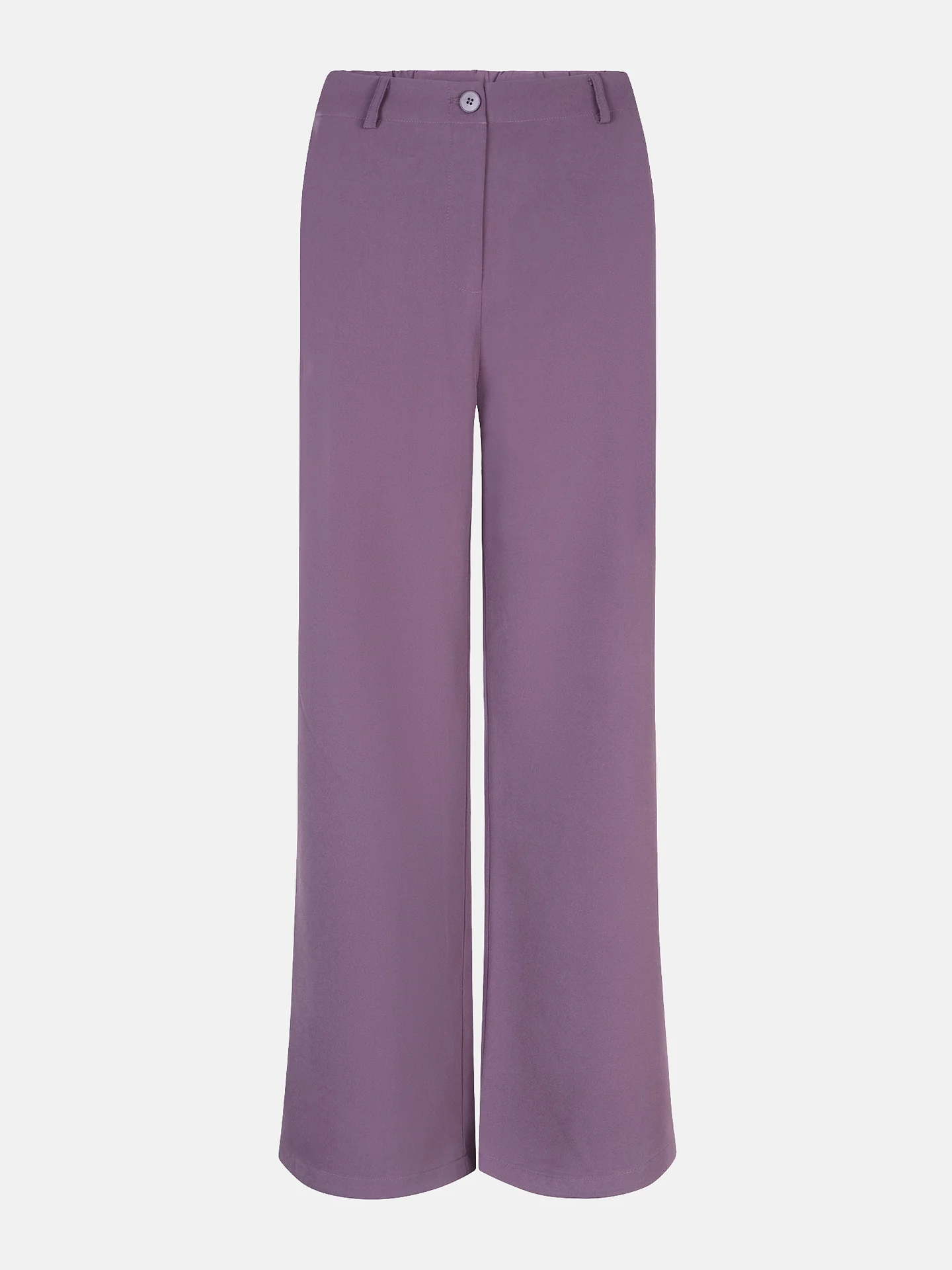 Pants Solange is een elegante pantalon met wijde, rechte pijpen. De pantalon heeft steekzakken aan de voorzijde en faux zakken aan de achterzijde. De pantalon sluit met een knoop- en ritssluiting en heeft een elastische tailleband aan de achterzijde. De pantalon is gemaakt van een rijke stof bestaande uit polyester en rayon. De lengtemaat is 108 cm en de binnenbeen lengte is 80 cm bij een maat S.