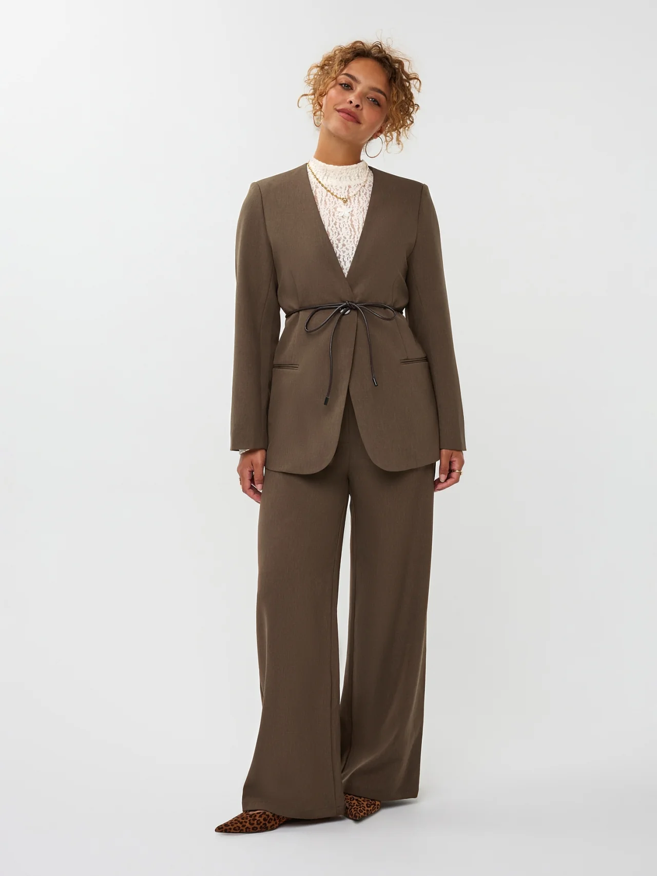 Blazer Lexie is een stijlvolle en moderne toevoeging aan je garderobe. Deze blazer heeft een getailleerde pasvorm en sluit met een enkele knoop aan de voorkant. De dunne leren ceintuur accentueert de taille en geeft het geheel een elegante, eigentijdse uitstraling. Met de diepe V-hals en minimalistische belijning is dit item perfect voor zowel zakelijke als casual gelegenheden. De totale lengte van blazer Lexie is 74,6 cm met een mouwlengte van 61 cm bij een maat S.