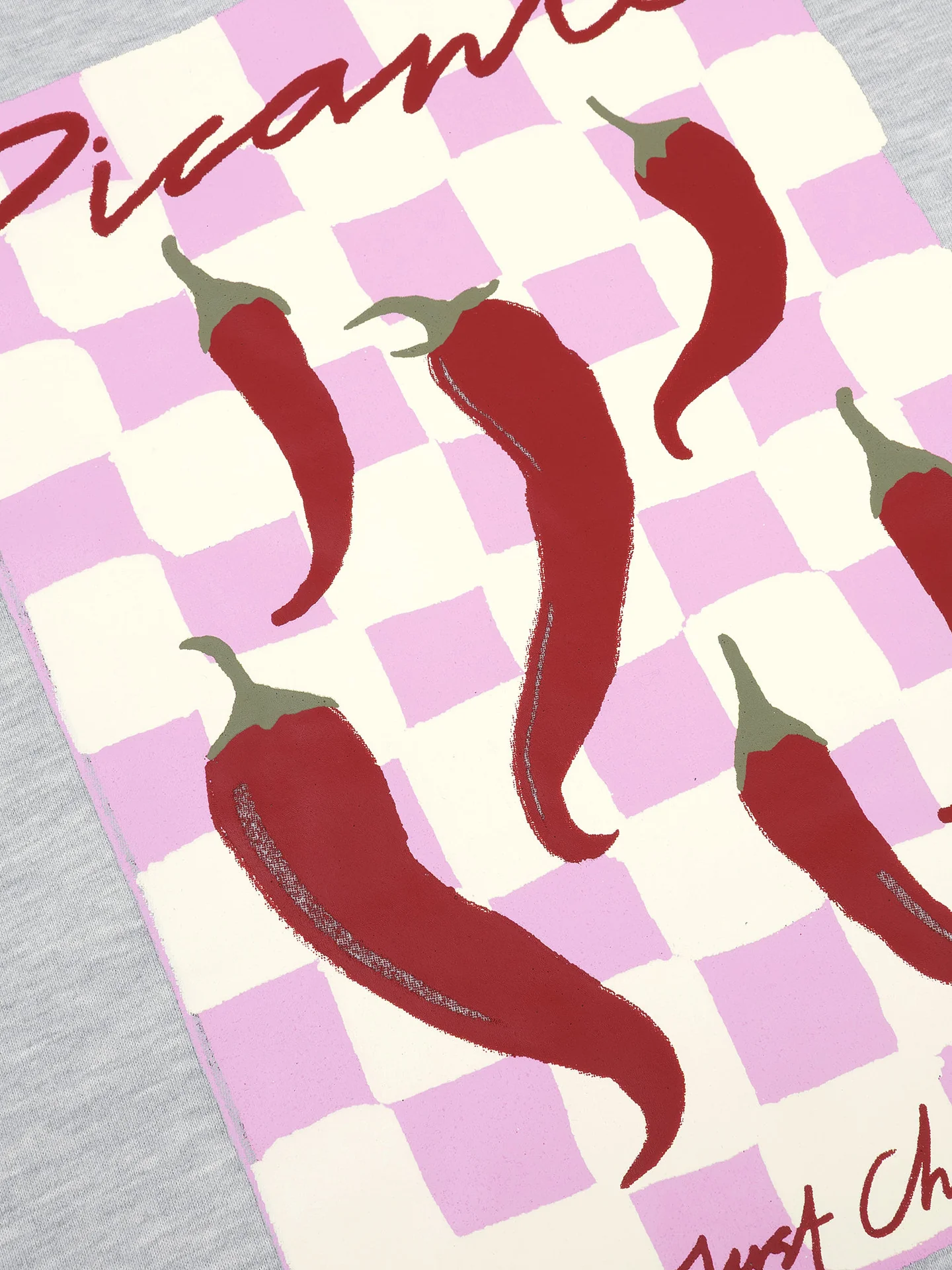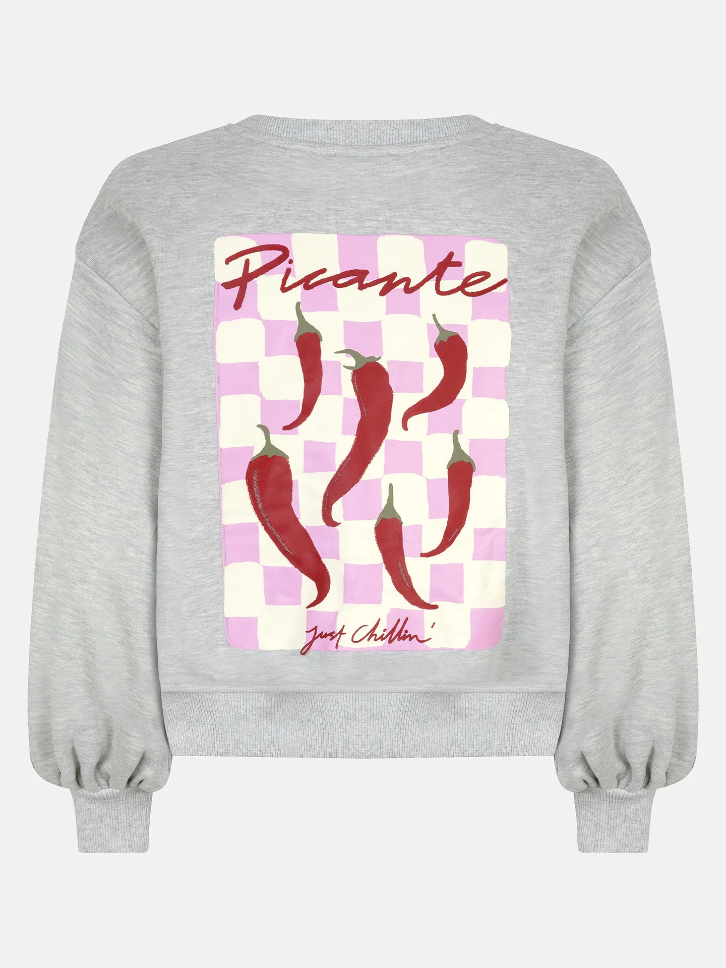 Sweater Just Chillin is een absolute bestseller en een must-have voor in je garderobe! Deze sweater heeft een relaxte pasvorm met een ronde hals en comfortabele boorden. Aan de voorkant is subtiel een rode chilipeper met de tekst Just Chillin verwerkt, wat zorgt voor een speelse touch. De achterkant steelt de show met een groot statementprint: rode chilipepers op een roze-wit geblokte achtergrond, gecombineerd met de opvallende teksten Picante en Just Chillin'. De totale lengte van sweater just chilling is 61 cm met een mouwlengte van 50 cm bij een maat S.