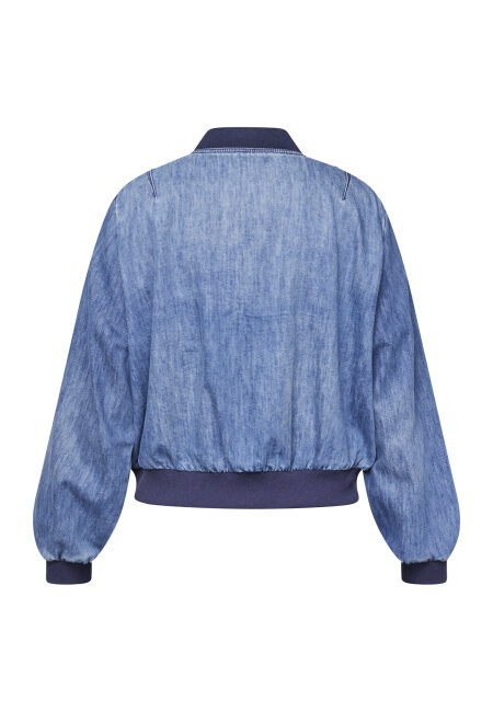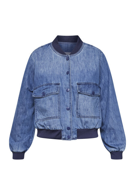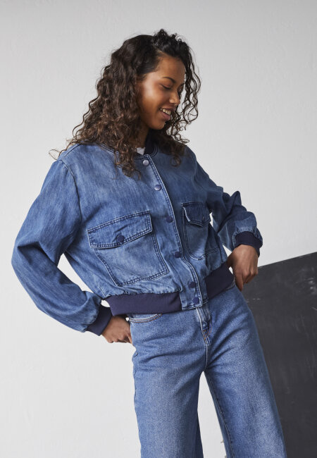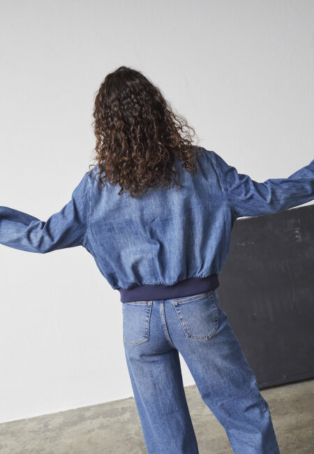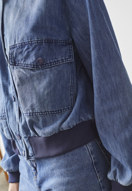 GARWIN-JA13 is a short denim jacket with button closure down the middle and two pockets on each side. The jacket has a wide ribbed elastic edge at the wrists, waist and neck. The model has a size S on.