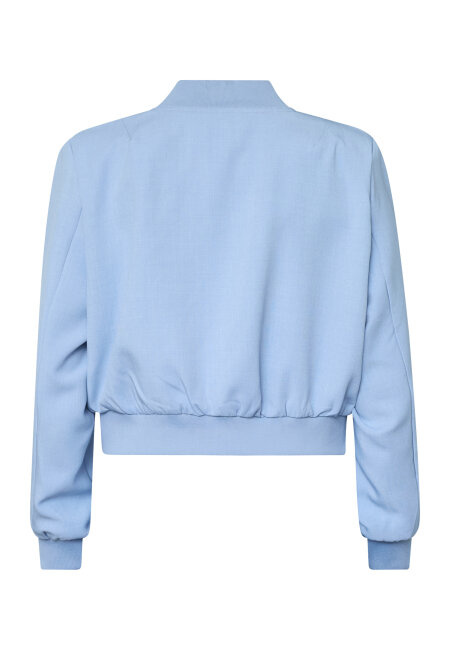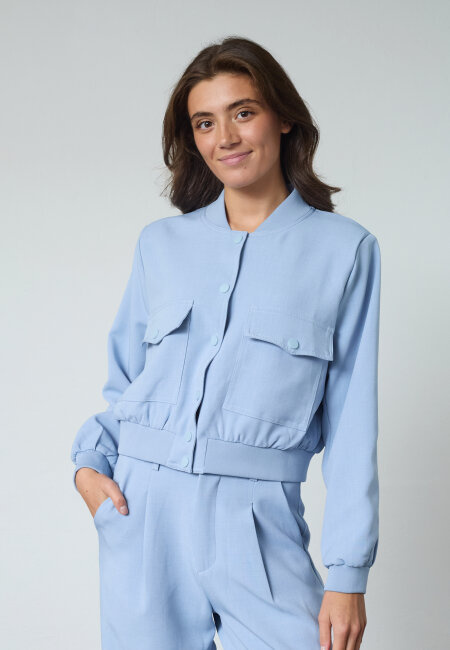GARWIN-JA20 is a short solid color jacket with button closure down the middle and two pockets on each side. The jacket has a wide ribbed elastic edge at the wrists, waist, and neck. The model is wearing a size S.
