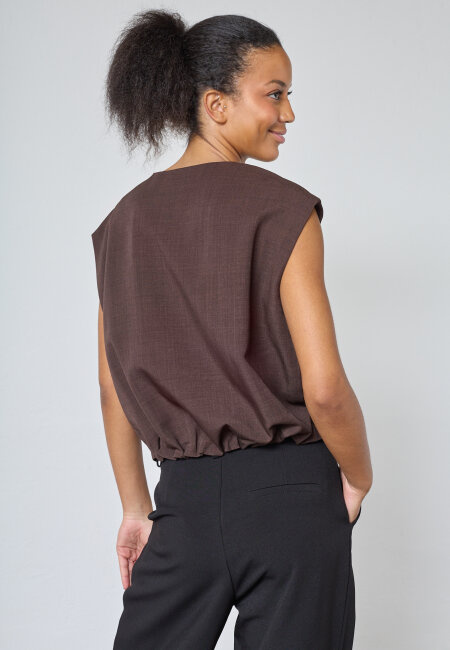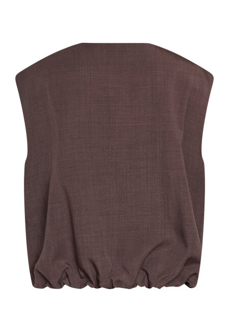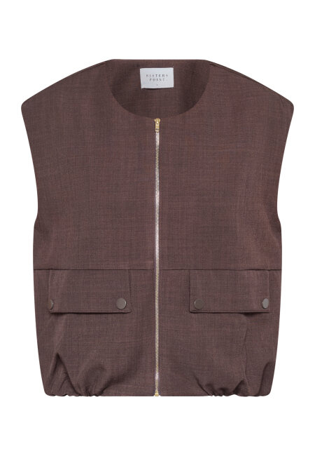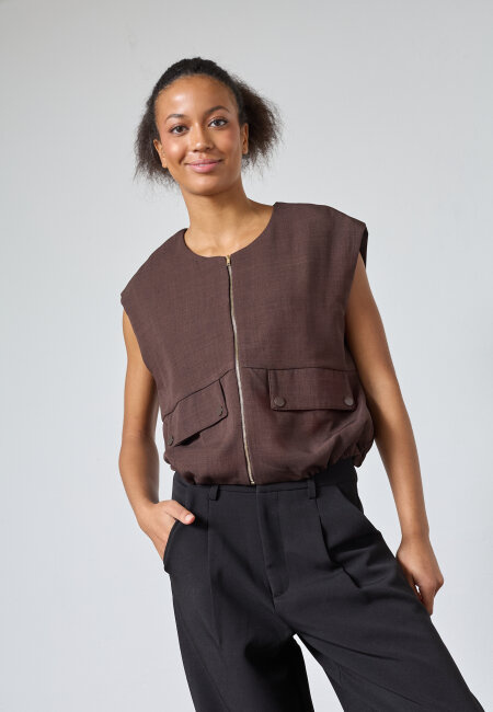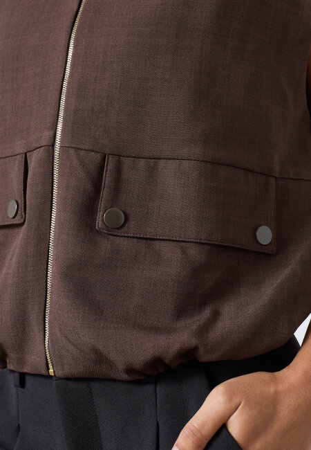 GARWIN-VE3 is a cool brown vest in a light, structured material. Zipper in the front, chest pockets, and an elastic waistband for a perfect fit. The model wears size S.