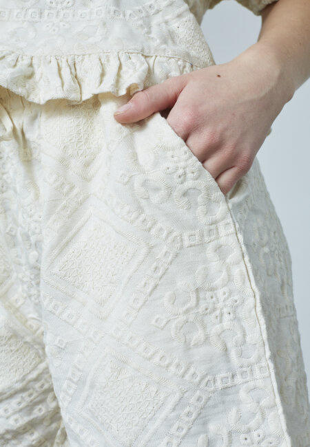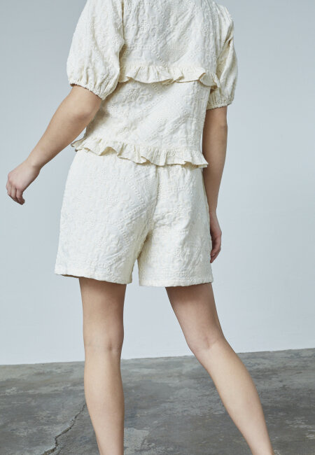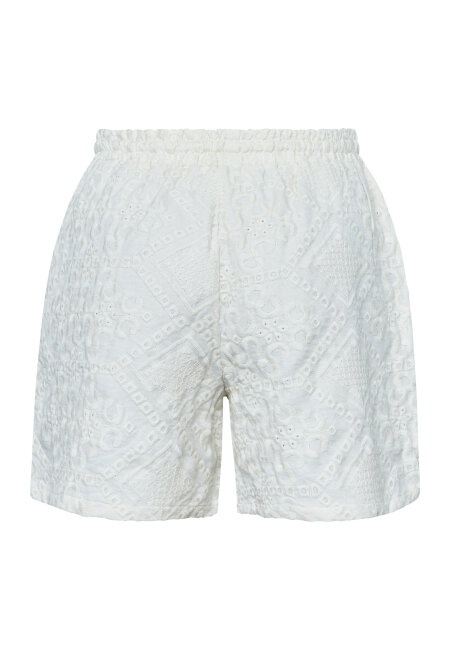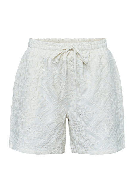 GILMA-SHO1 are a pair of lightweight shorts with a high waist and elastic and a tie at the front. The shorts have an embroidered pattern in the fabric and a relaxed fit. The model has a size S on.