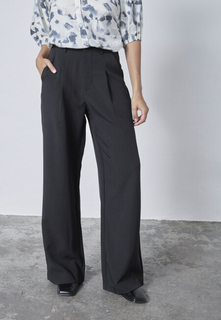 GREAT-PA3 is a pair of wide trousers with a high waist and pleats in the front. The trousers have side pockets and close with a hook, button, and zipper. The legs have a straight fall. The model is wearing a size S.