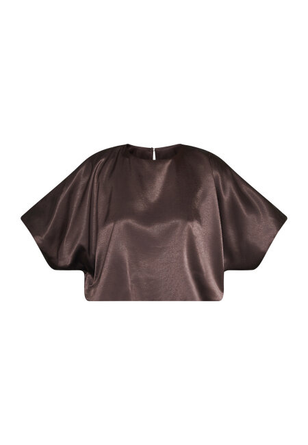 GUFO-TOP1 is a elegant brown top with a beautiful satin finish. The loose fit, short sleeves, and elastic hem give a modern yet classic look. The model wears size S.