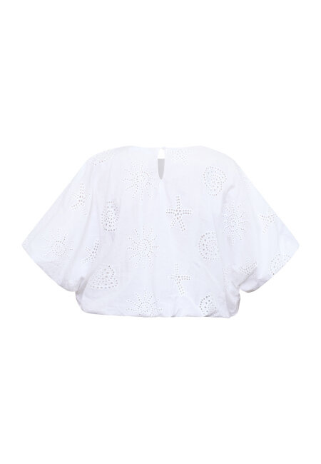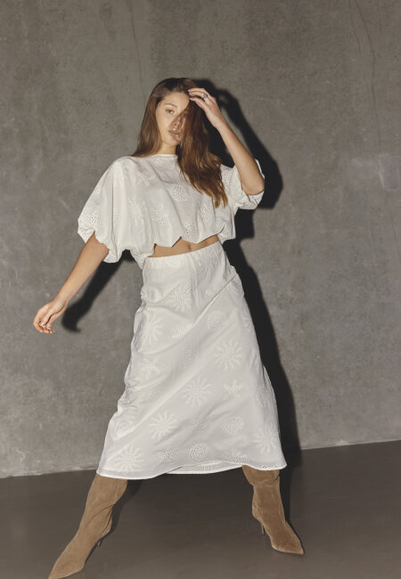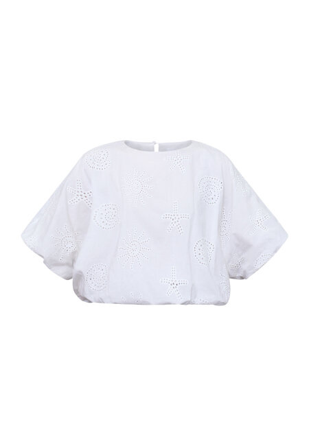 GUFO-TOP4 is a boho-inspired top in lightweight cotton with decorative eyelet embroidery and feminine cutout details. The blouse has a relaxed fit with voluminous puff sleeves. The model is wearing a size S.