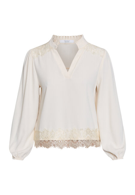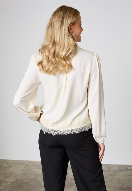 GYLA-LS is a feminine blouse with a loose fit. It has a short cut, a slightly gathered neckline, and beautiful lace details on the shoulders and bottom. The fabric is light. The model is wearing a size S