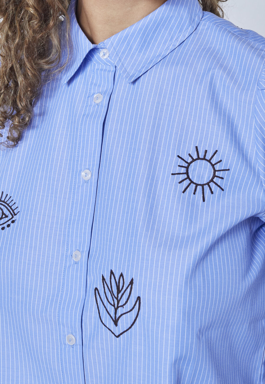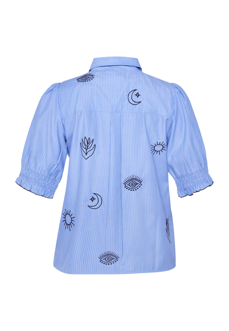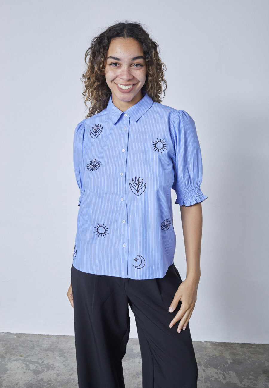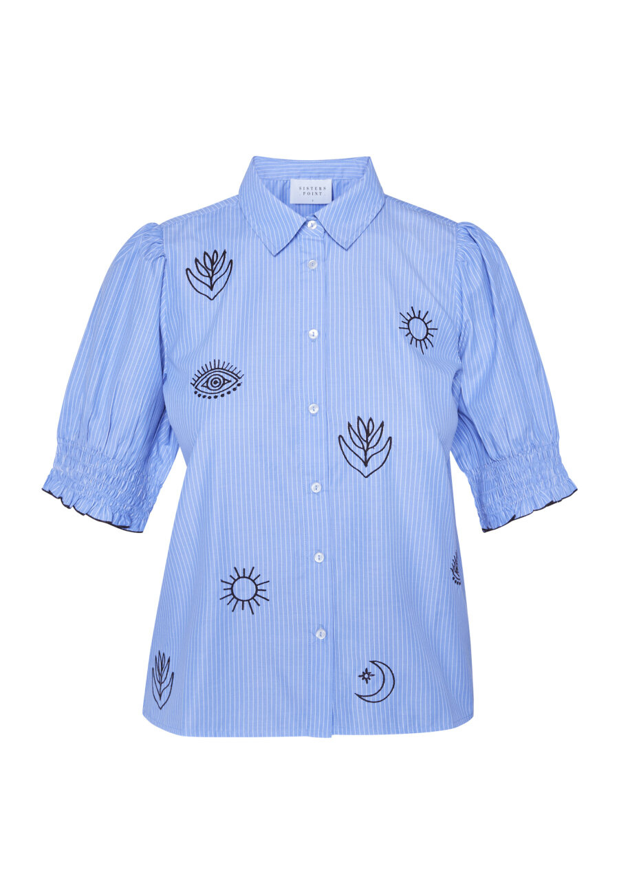ISOLA-SS8 is a striped shirt with short puff sleeves and embroidered symbols. It features a classic collar, full-length button closure, and a relaxed fit. The model is wearing size S.