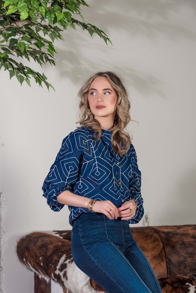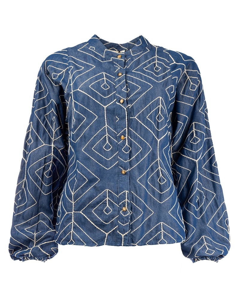 Luchtige blouse met borduursel en gave gele knopen.