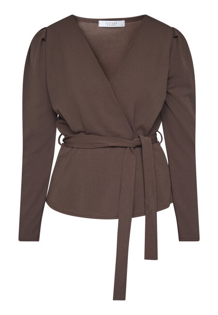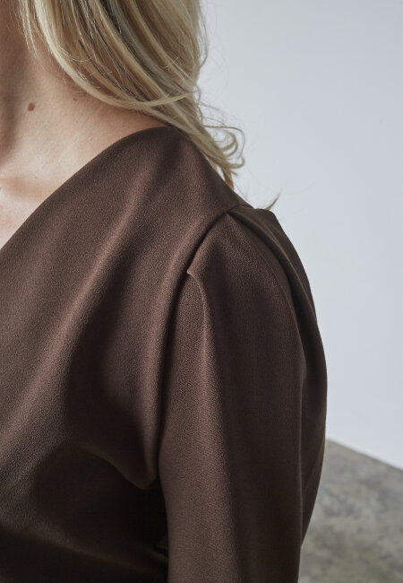NASA-LS is a feminine plain shirt with a deep v-neck and a belt at the waist. The model has a size S on.
