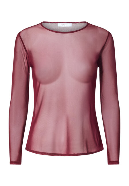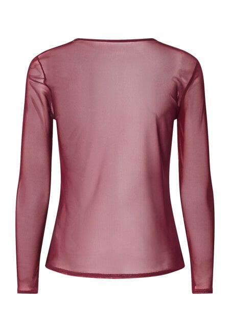 NEW GANI-22 is a long-sleeved mesh top. The outer layer is transparent mesh. The neckline is boat-shaped. The model is wearing a size S and is 175 cm tall.