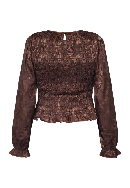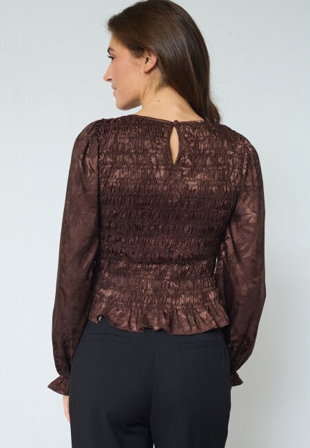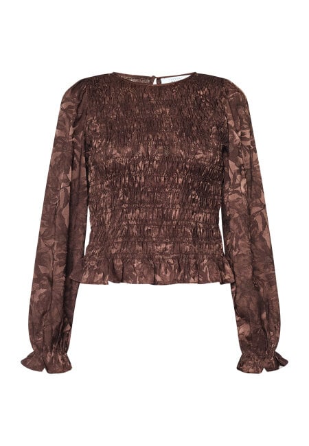 NIX-LS16 is a long-sleeve blouse made of satin material with a floral pattern. It features smocking over the chest and back. The shoulders are slightly puffed, and the blouse has ruffle detailing. The model is wearing a size S.