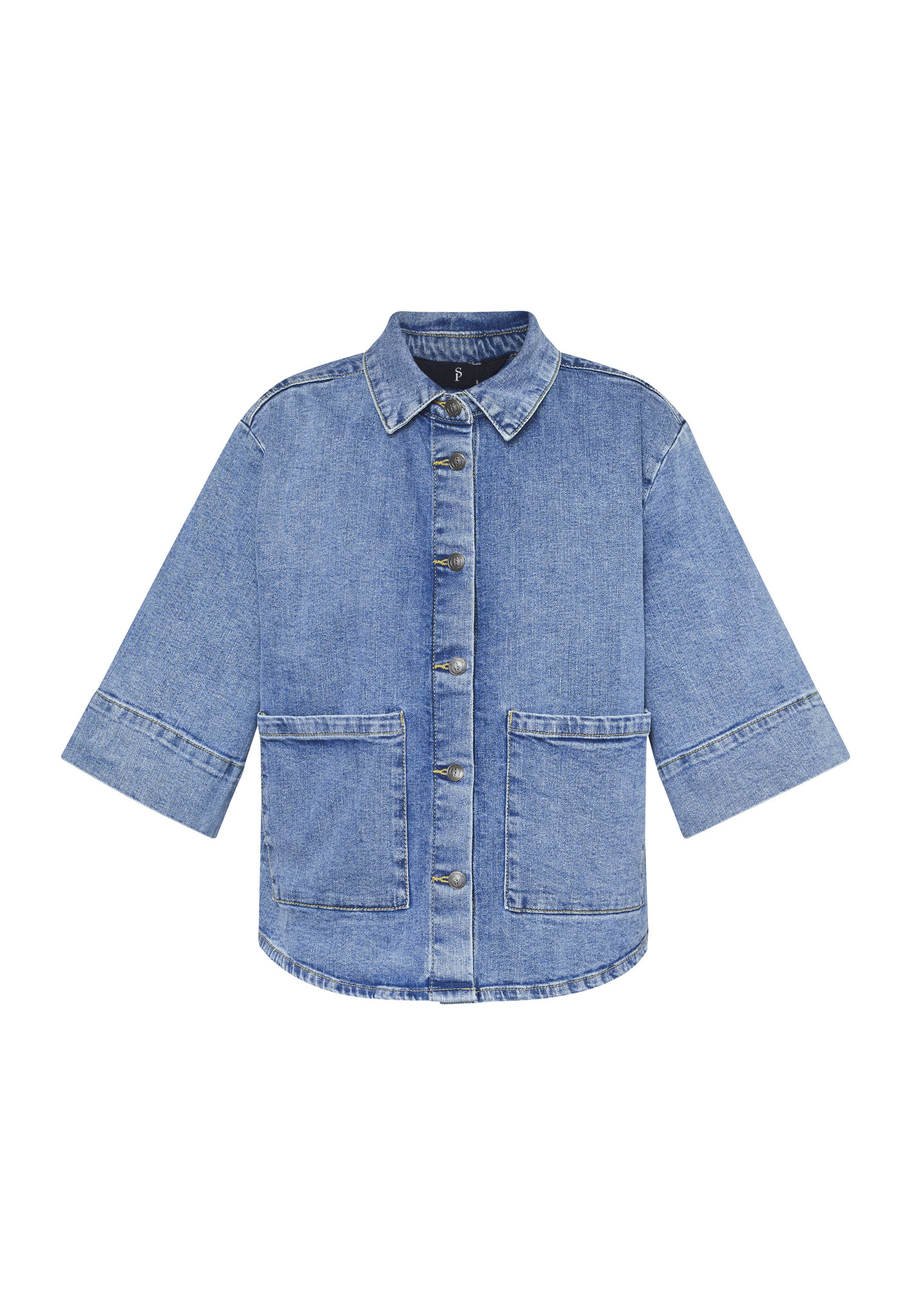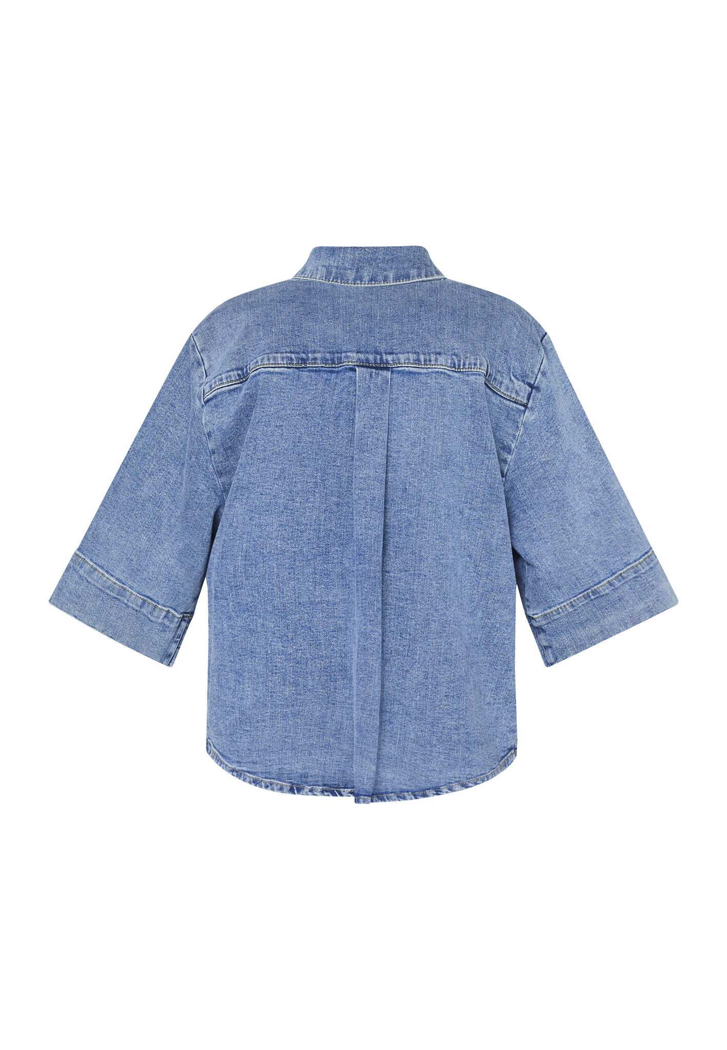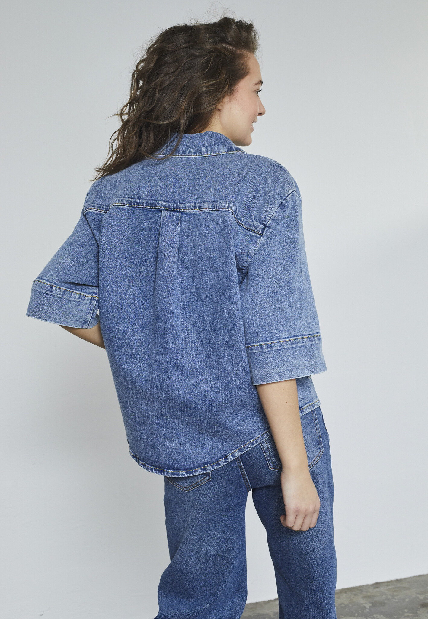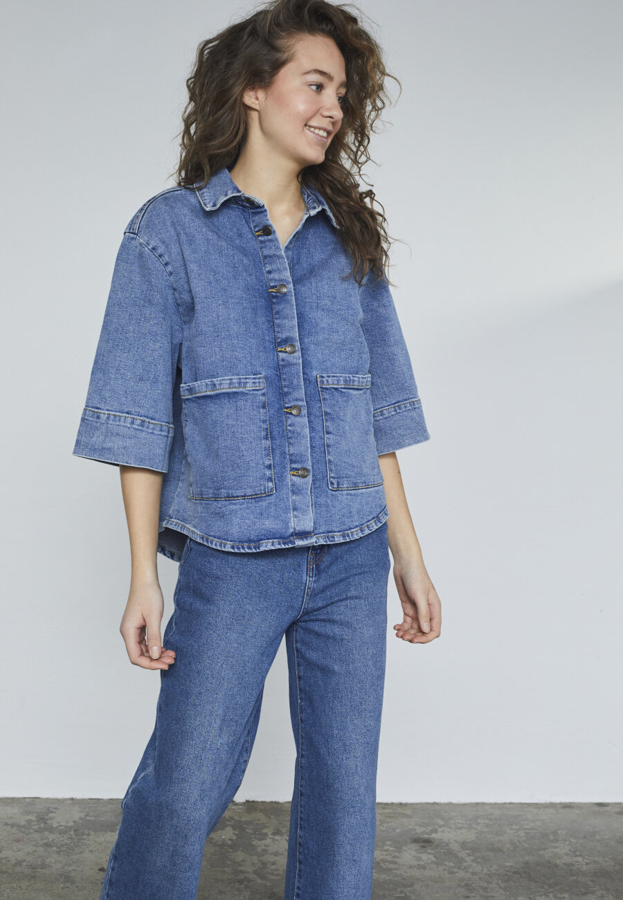 OLEA-JA9 is a trendy denim jacket with a regular fit. The jacket has large and wide three-quarter length sleeves and pockets on each side. The model has a size S on.
