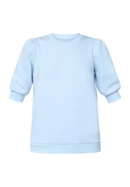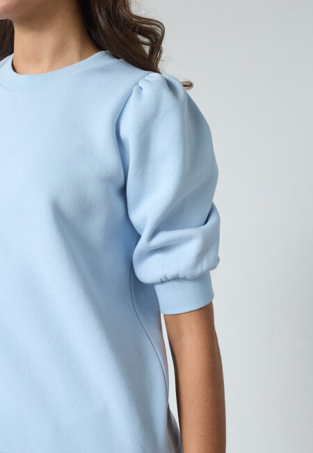 Peva Puff SS is a regular sweatshirt with three-quarter puffs at the sleeves and with ribbed edges. It is very soft inside and is available in several colors. The model has a size S on.