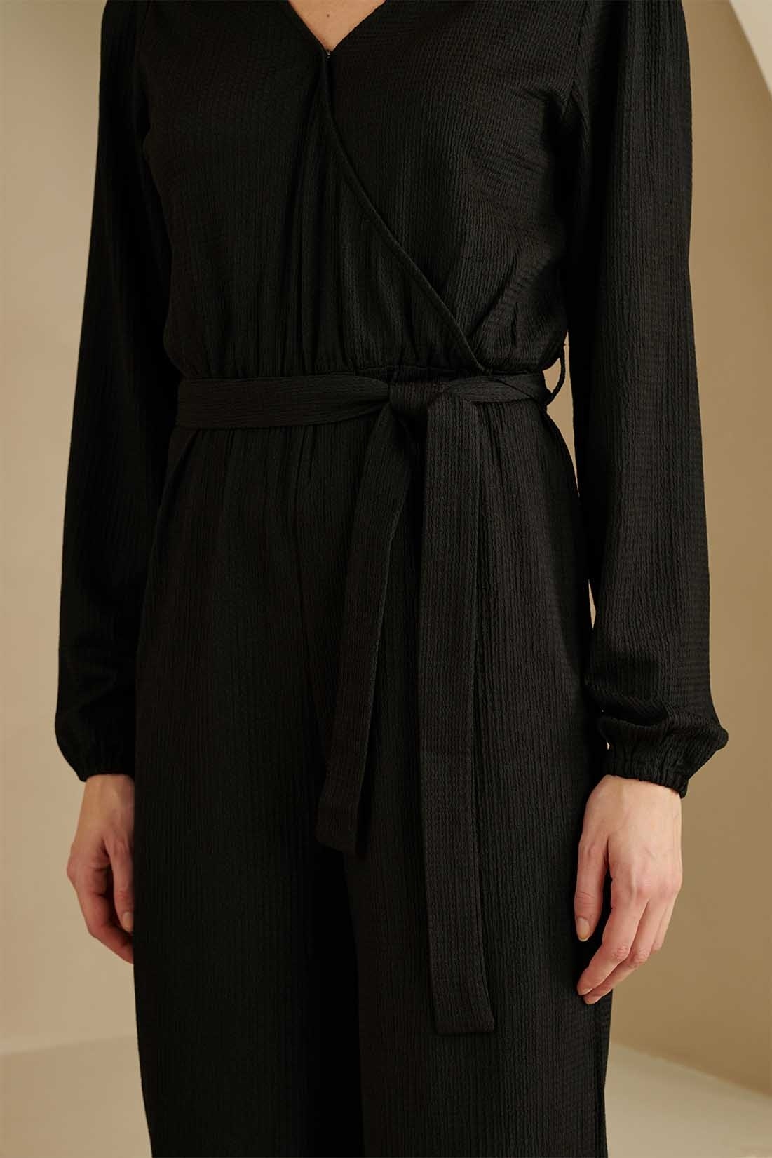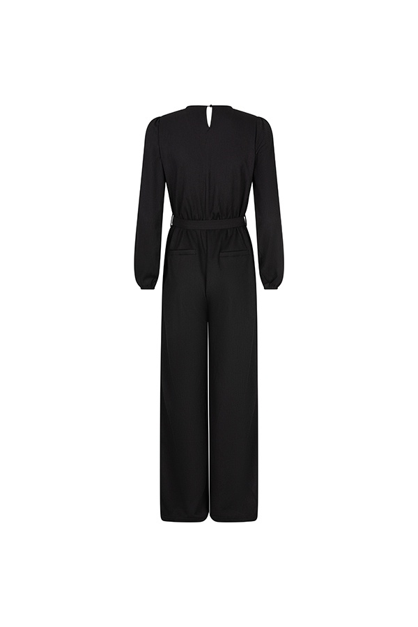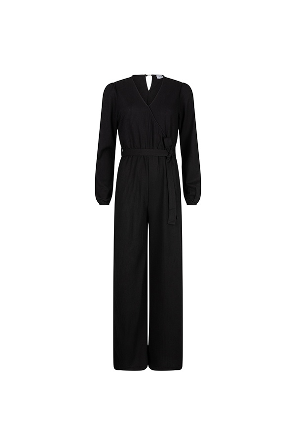 Jumpsuit Avah is een zwarte jumpsuit met een overslag met drukknoopje, pofmouwen met elastieken mouwuiteinden en rechte broekspijpen. De zwarte jumpsuit is gemaakt van een stretchy stof en heeft een elastiek in de taille. Verder heeft het pak nepzakken aan de achterkant en riemlussen met een afneembare riem.