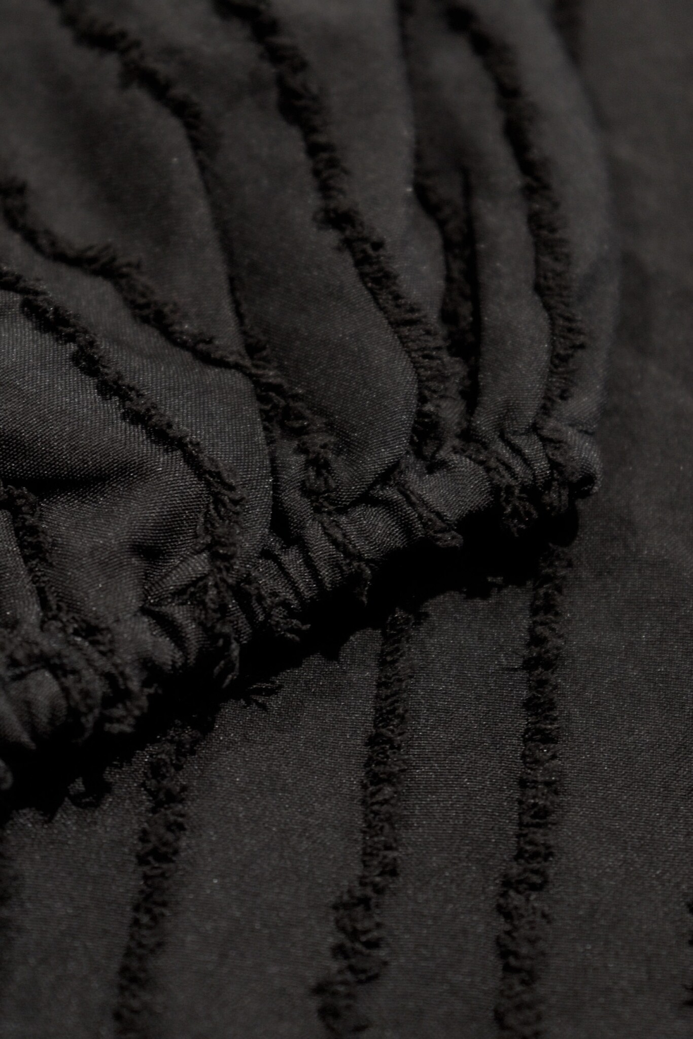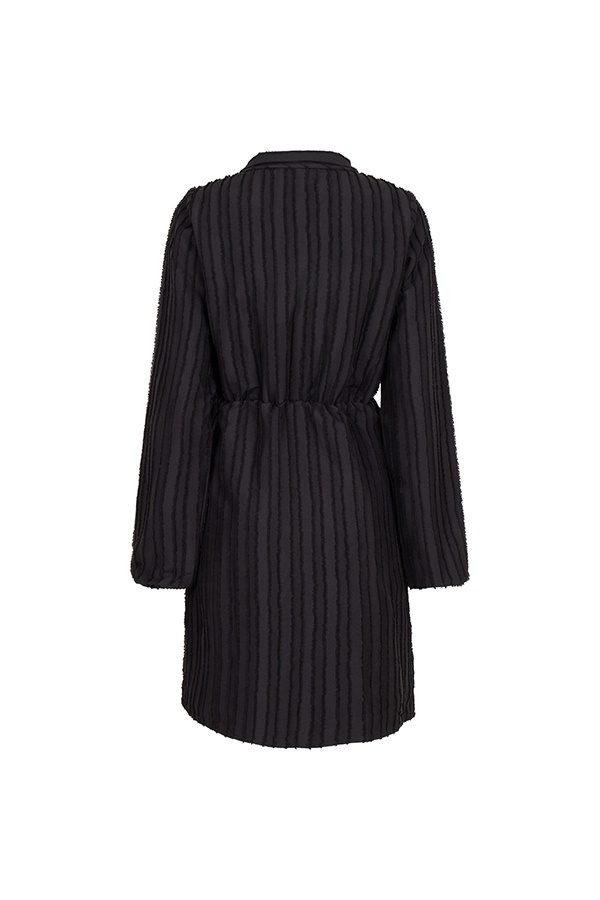 Jurk Madelyn is een zwarte jurk met een overslageffect en een onzichtbare drukknoop bij de borst. De wrap dress heeft een strikgedeelte aan de linkerkant, elastieken mouwuiteinden en elastiek in de taille. Qua fit is de jurk rechtvallend.