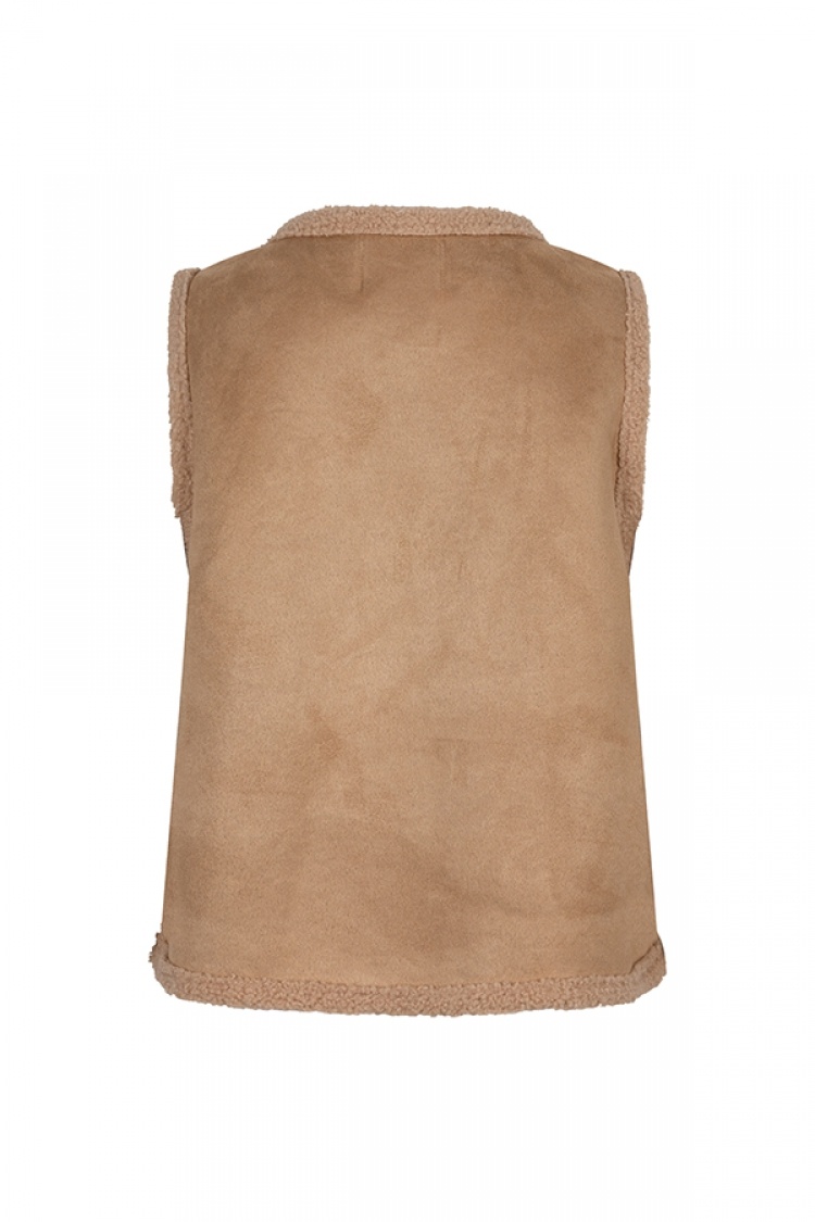 Gilet Mois is een beige gilet met aangesloten fit. Het jasje zonder mouwen is iets korter en de randen van het gilet zijn voorzien met een teddy stof.