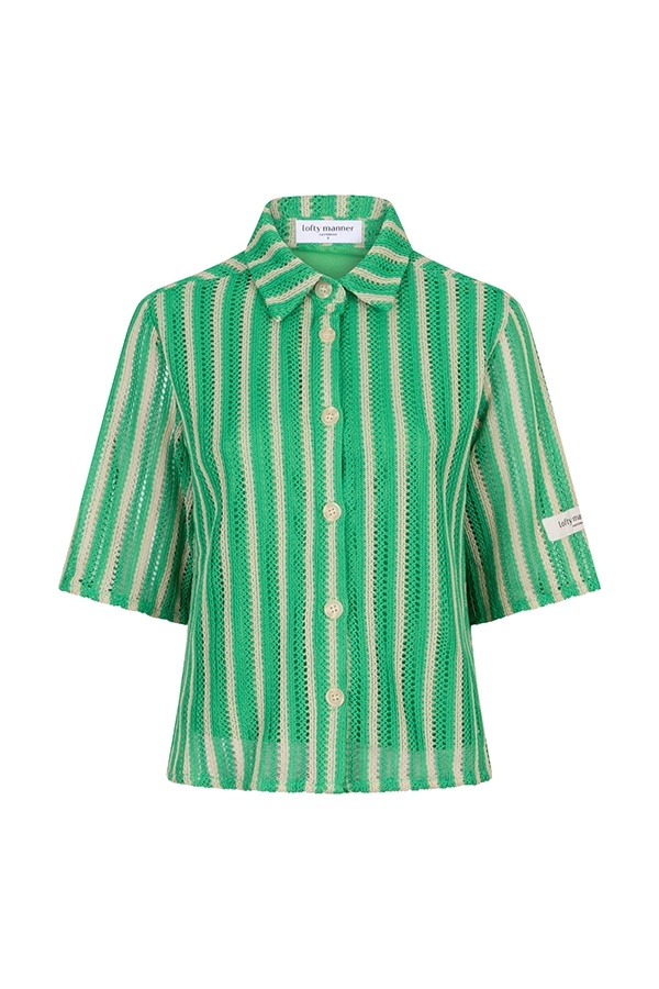Blouse Sanaa is een groene blouse met klassieke kraag, korte mouwen en rechtvallende pasvorm. De blouse is gemaakt van een luchtige crochetstof en valt qua model iets korter.