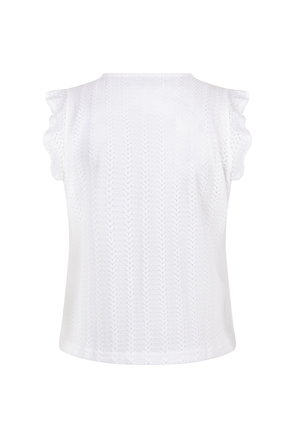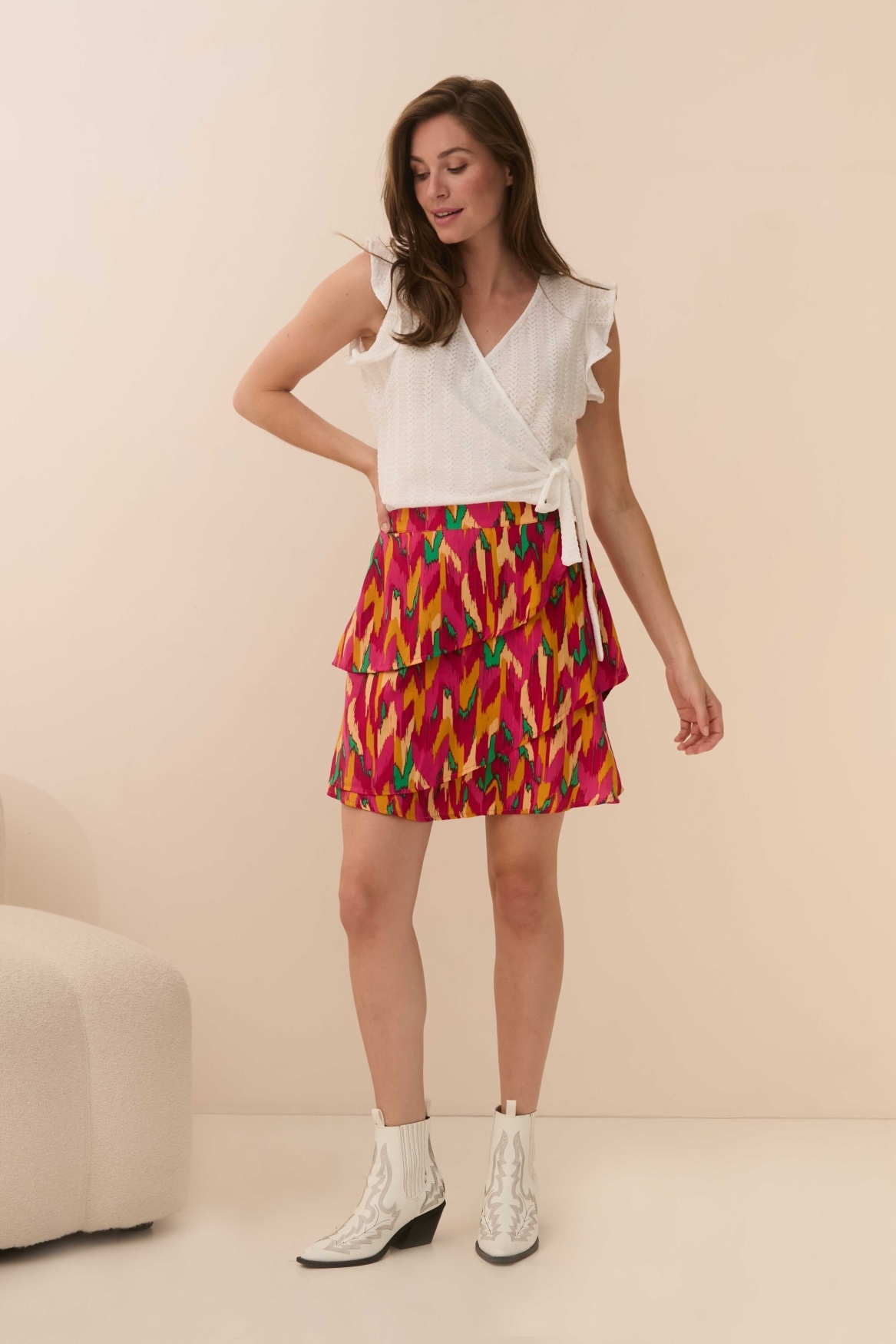 Top Femi is een witte wrap top met ruffles bij de mouwen en strikdetail aan de linkerdraagkant. De witte top heeft een aansluitende pasvorm.
