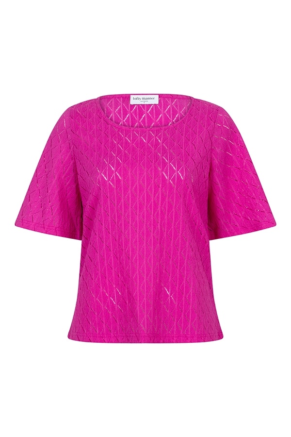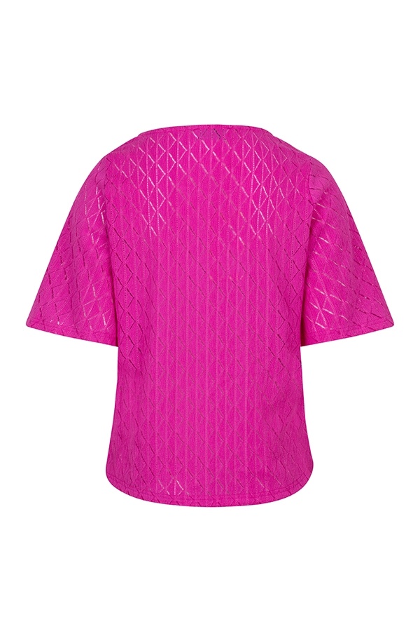 Top Kiki is een roze top met gehaakt patroon in de stof. De roze top heeft een ronde hoge hals, korte mouwen en een rechtvallende pasvorm.