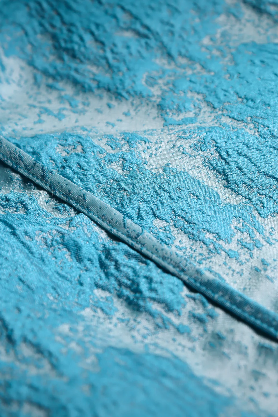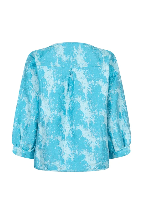 Jacket Shann is een blauw jasje gemaakt van jacquard stof. Het blauwe jasje heeft driekwart pofmouwen en zakken aan de voorkant.