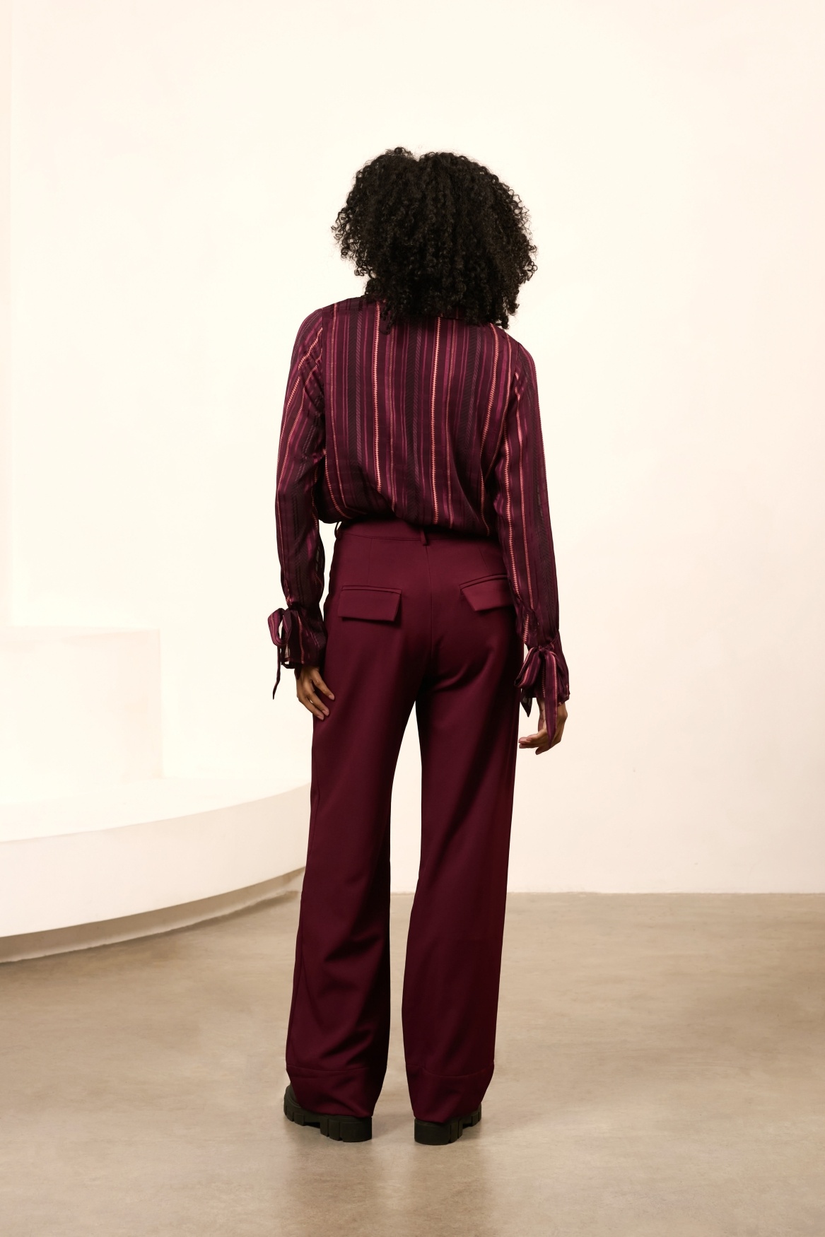 Blouse Mette is een bordeauxrode blouse met print. De blouse heeft een klassieke kraag, knoopjes over de gehele lengte en een strikdetail bij de mouwuiteinden. De gekleurde blouse is qua pasvorm rechtvallend.