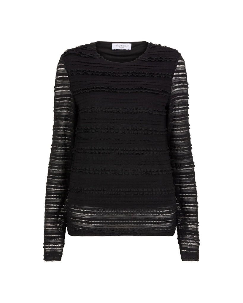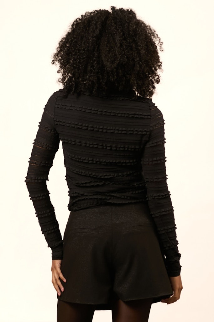 Top Alva is een zwarte top met ruches. De top heeft een hoge ronde hals, bevat veel stretch en is qua pasvorm aansluitend.