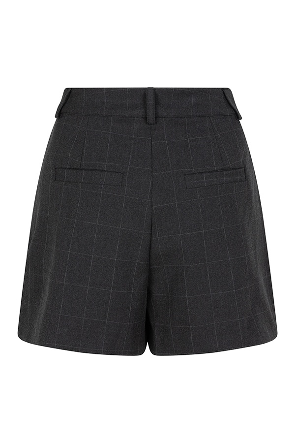 Short Rikke is een grijze high waisted short met plooidetails. De short heeft zowel steek- als paspelzakken, riemlussen en een hook & eye- en ritssluiting. Verder is de grijze short gemaakt van een geweven stof met ruitjespatroon en is de short qua pasvorm rechtvallend.