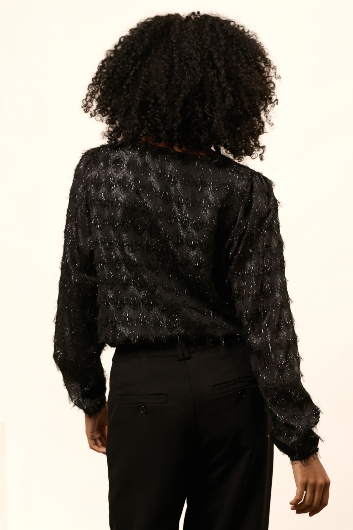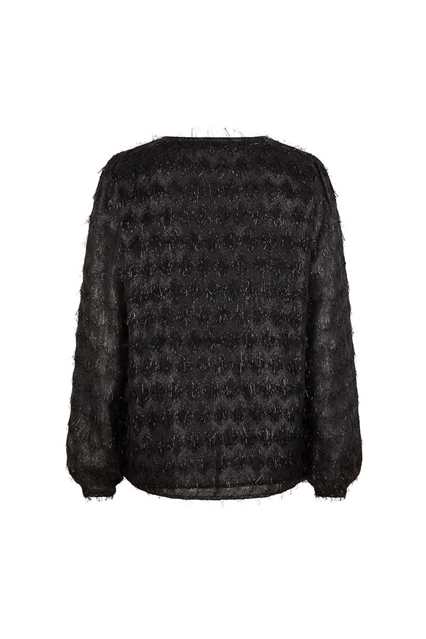 Blouse Amara is een zwarte blouse met V-hals. De zwarte blouse heeft elastieken mouwuiteinden en is gemaakt van een geweven stof met lurexdetails. De blouse is qua pasvorm losvallend.