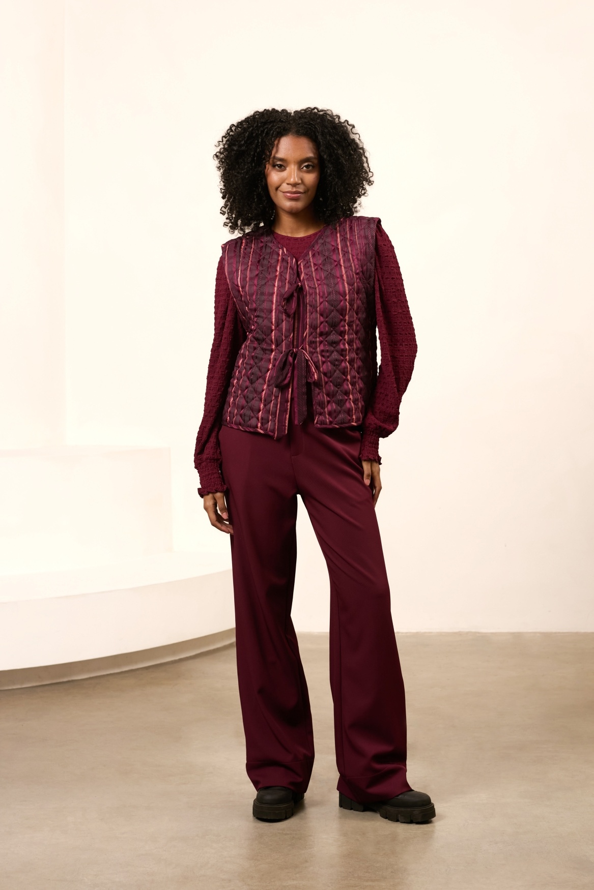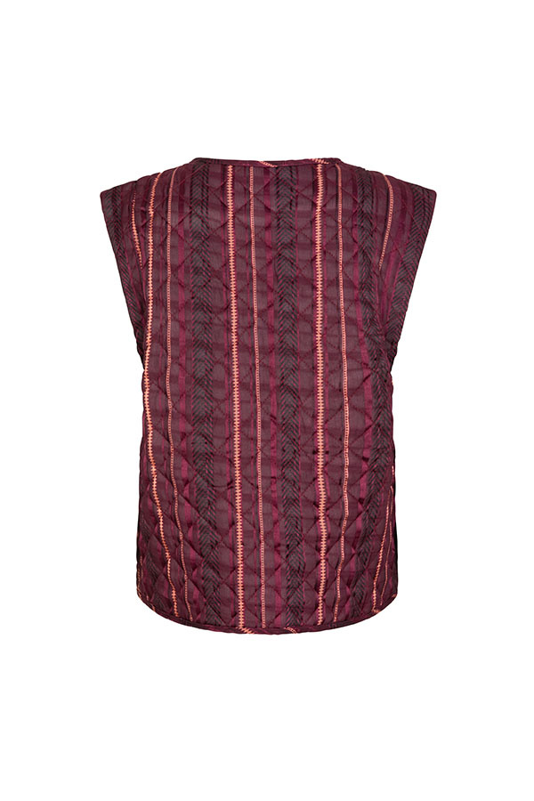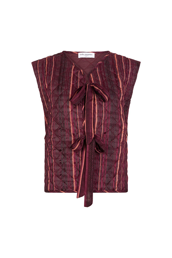 Gilet Lilli is een kleurrijk gewatteerd gilet. Het gilet heeft een hoge ronde hals en is dicht te maken door twee striksluitingen aan de voorkant. Het jasje zonder mouwen is qua pasvorm losvallend.