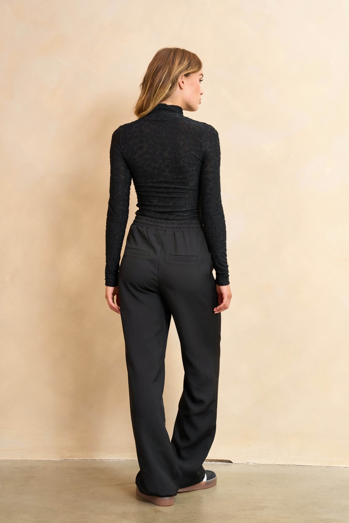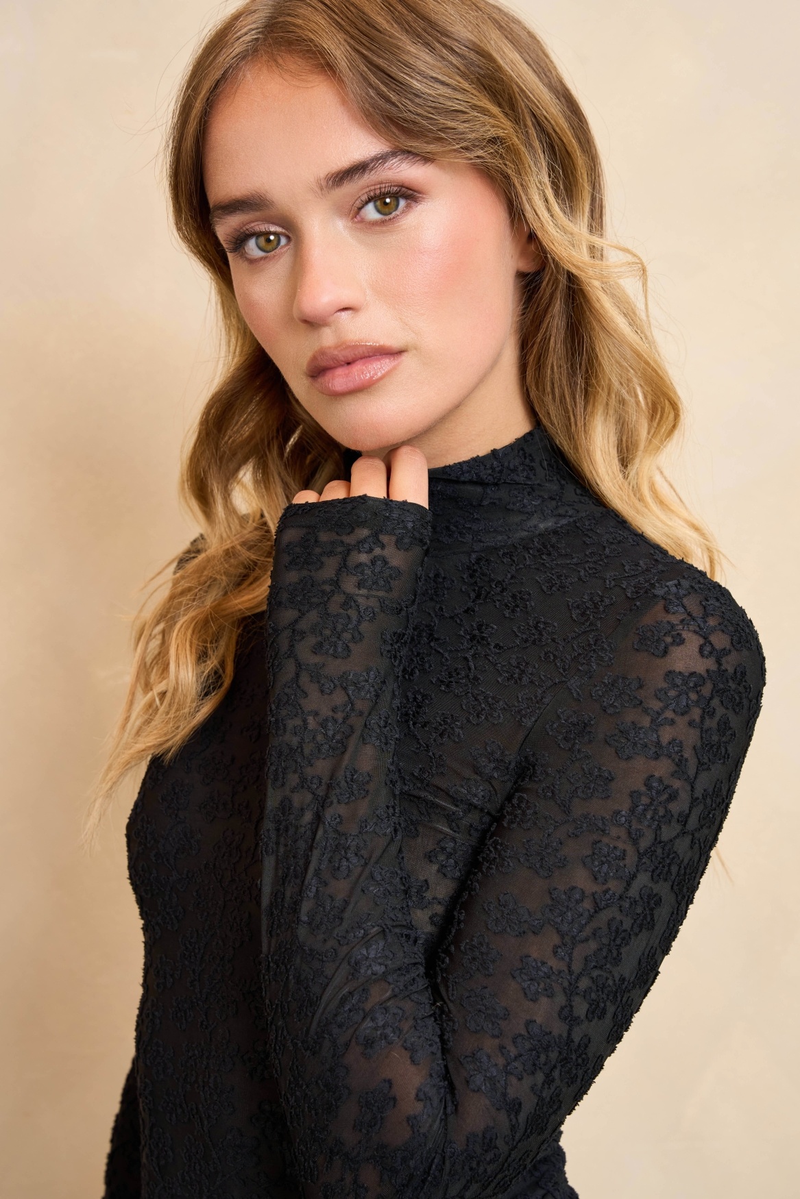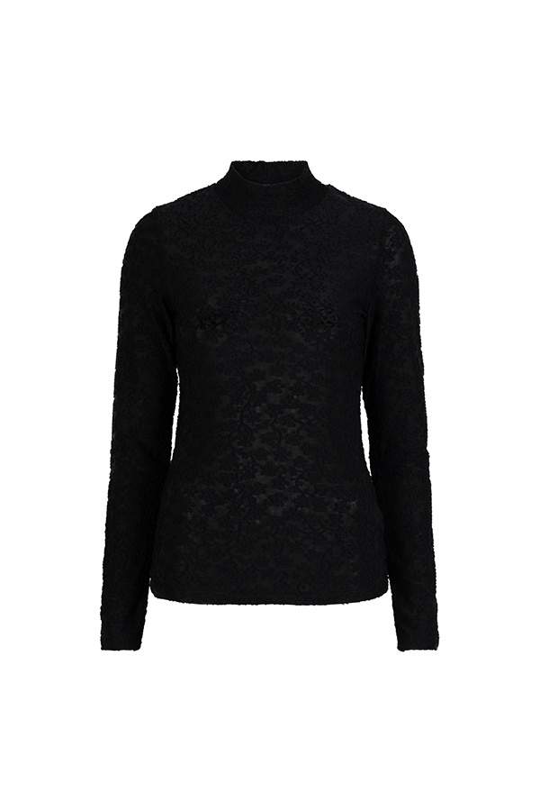 Top Eliora is een aangesloten zwarte koltrui. De top heeft een kanten look en subtiel see through effect. In de stof is een prachtig bloemenmotief verwerkt.