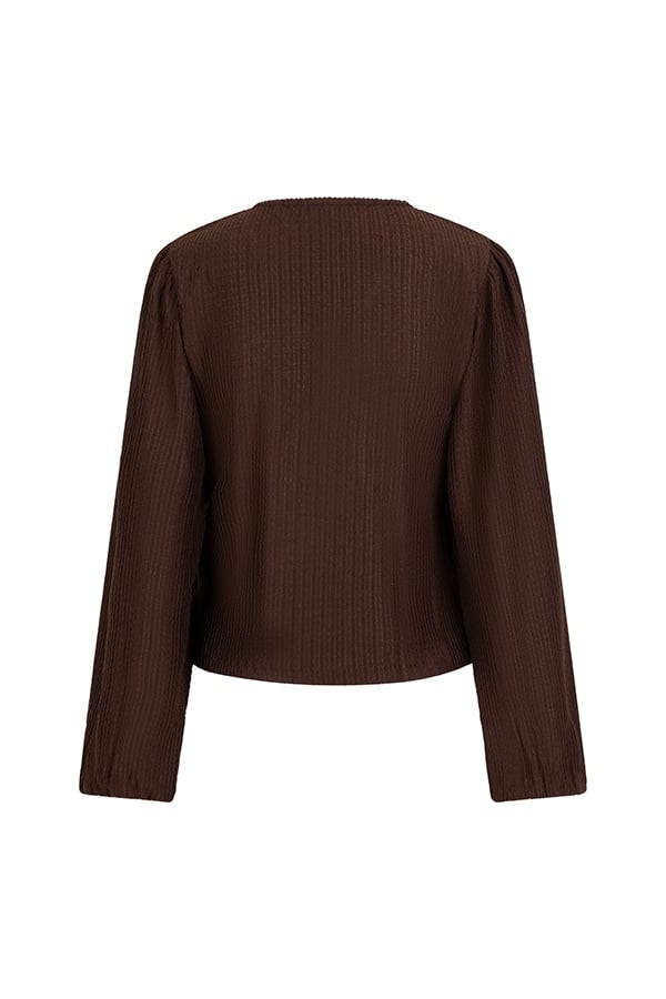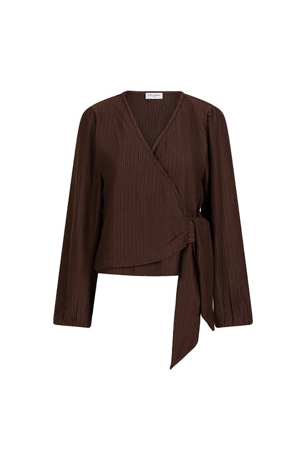Top Minna is een bruine wrap top met V-hals. De bruine top heeft een strikdetail aan de linker draagkant, subtiele pofmouwen en bevat veel stretch. De top is qua pasvorm aangesloten.