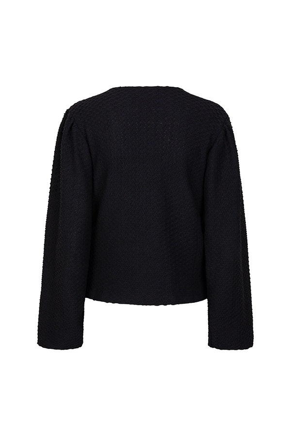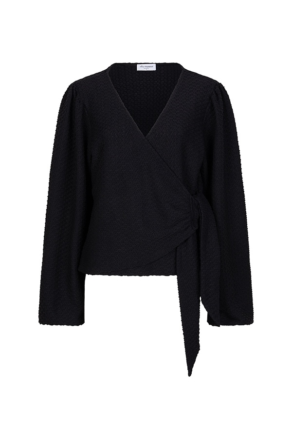Top Ciri is een zwarte wrap top. De zwarte top heeft subtiele pofmouwen en is te sluiten door een strik aan de linker draagkant. De top bevat veel stretch en is qua pasvorm aansluitend.