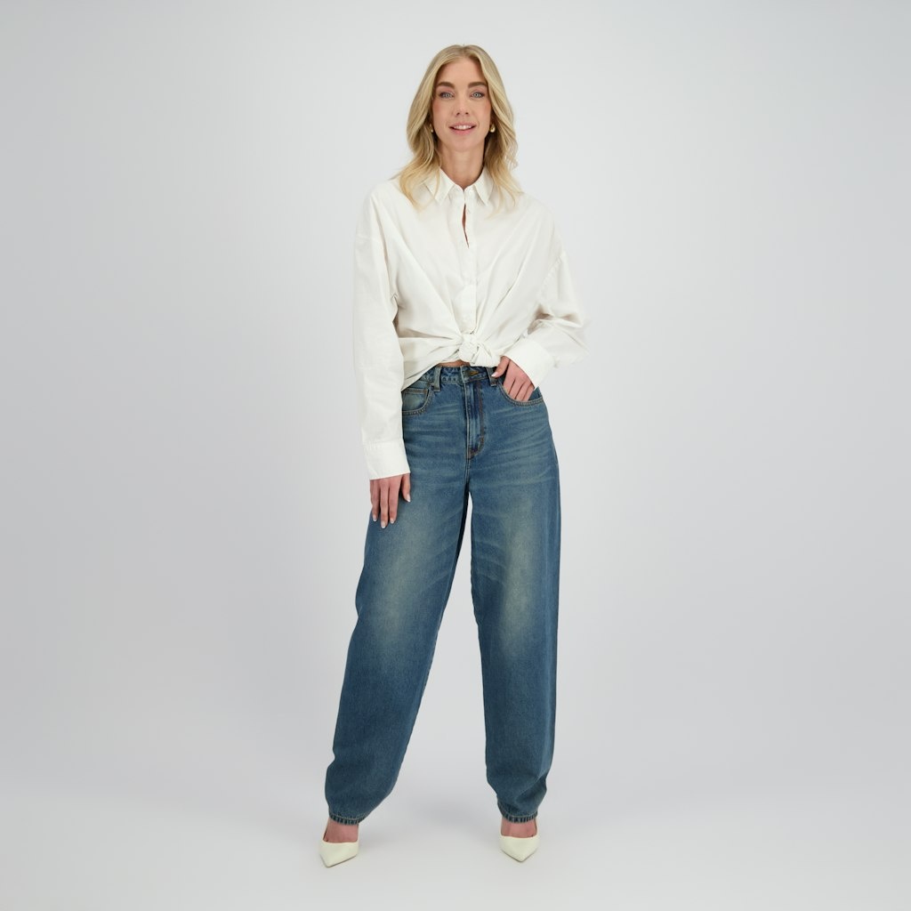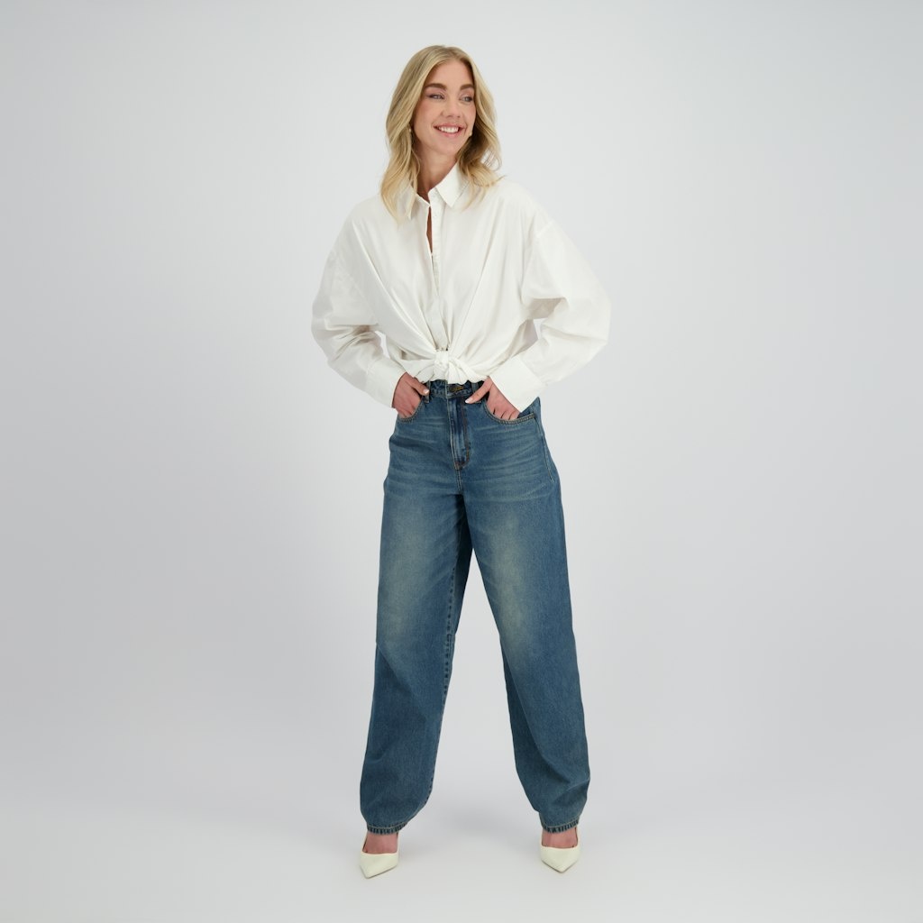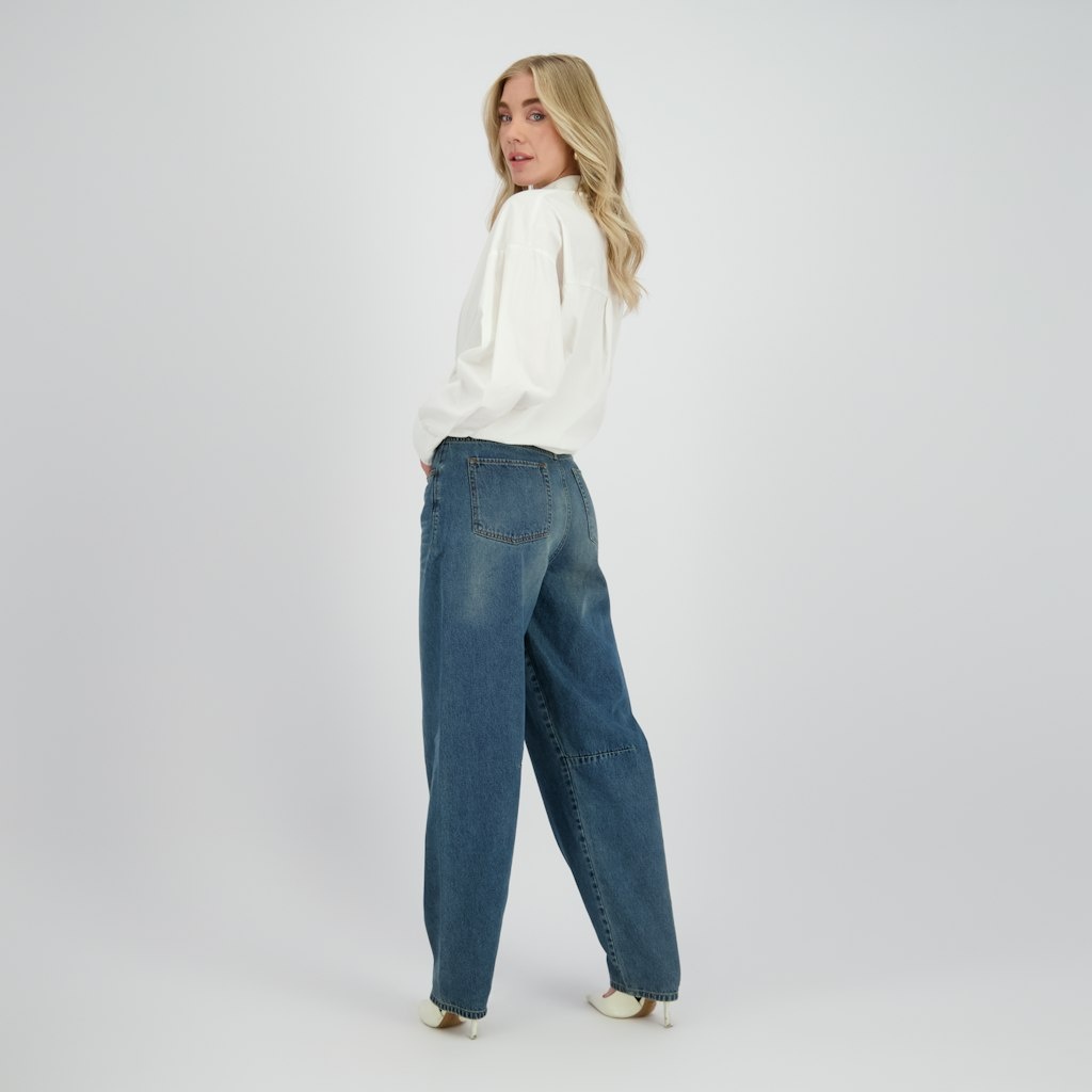 Deze jeans met gave wassing en coole details kun je niet aan je voorbij laten gaan. De jeans is van 100% katoen en kan versteld worden bij de taille.
