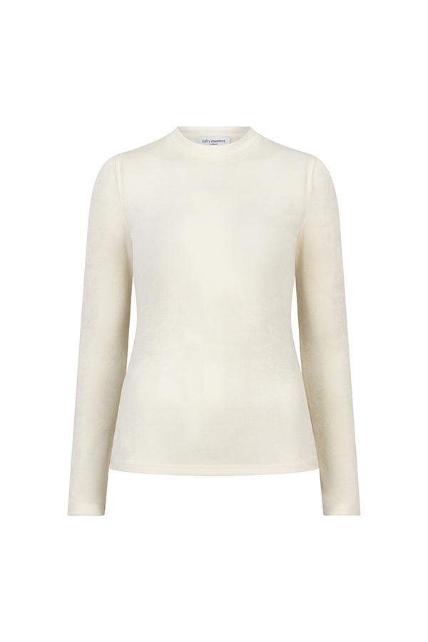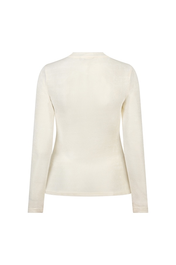 Top Arlina is een ecru top met ronde hals en lange mouwen. De aangesloten pasvorm en zachte stretch maken dit item prettig om te dragen. De subtiele shimmer geeft een verfijnde uitstraling die makkelijk combineert met elke outfit.