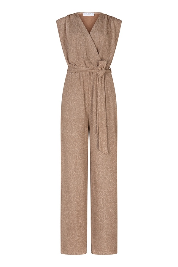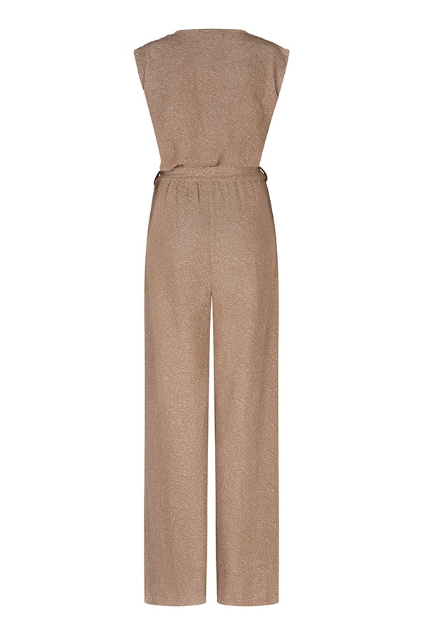 Jumpsuit Celyn is een gouden straight fit jumpsuit met elastieke tailleband en afneembare riem. De sleeveless V-hals overslag en lichte glans van de stof geven een elegante uitstraling. Combineer met heels voor een avondlook.