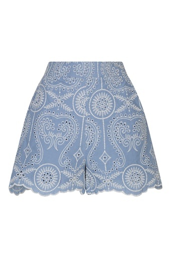 Short Solee is een blauwe short met een rechte pasvorm en elastiek achterin de taille. De short is gevoerd en heeft steekzakken. De geborduurde stof geeft een subtiele twist. Ideaal om te combineren met een blouse of een top.
