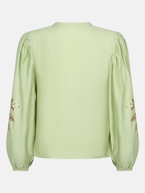 Blouse Rose is een elegante en verfijnde blouse met een linnenlook. De echte blikvanger van deze blouse zijn de mouwen. De lange, gepofte mouwen zijn verrijkt met een verfijnd paillettenpatroon in een sierlijke bloem- en bladstructuur. De goudkleurige pailletten zijn zorgvuldig aangebracht en zorgen voor een subtiel sprankelend effect dat prachtig contrasteert met de rustige, lichte basis van de stof. De totale lengte van Blouse Rose is 62 cm met een mouwlengte van 61 cm bij een maat S.