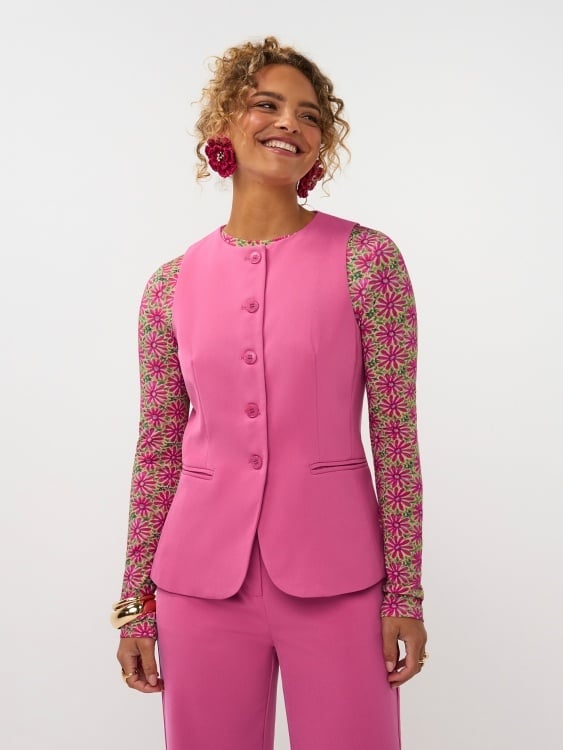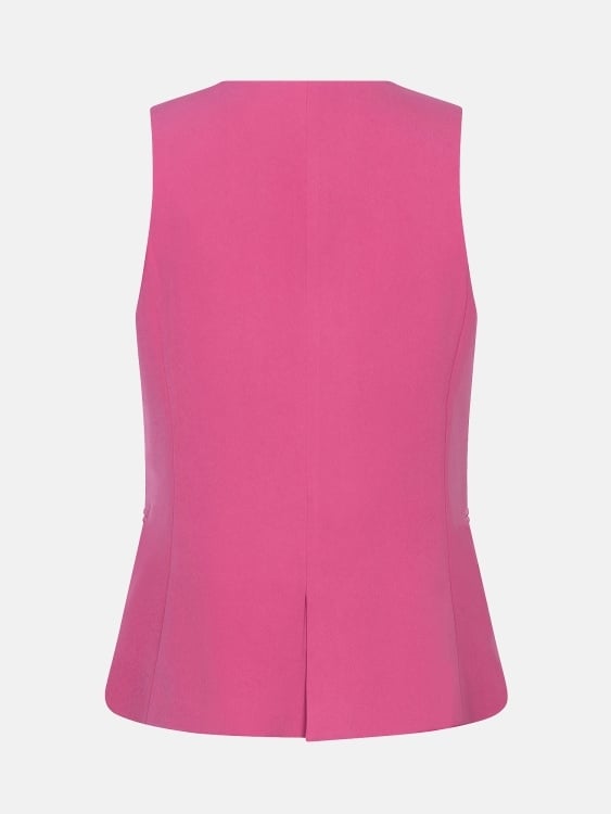 Gilet Fabienne is een stijlvolle toevoeging aan je garderobe met een klassieke twist. Dit gilet heeft een vrouwelijke, licht getailleerde pasvorm en sluit met vijf knopen aan de voorkant. De subtiele sierzakjes zorgen voor een elegante en minimalistische uitstraling. Dankzij de dikke stof en nette afwerking is dit item zowel zakelijk als casual te dragen. De totale lengte is 62 cm bij een maat S. Perfect te combineren met pants Solange voor een co-ord.