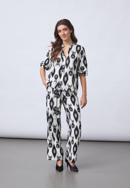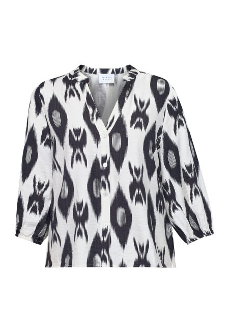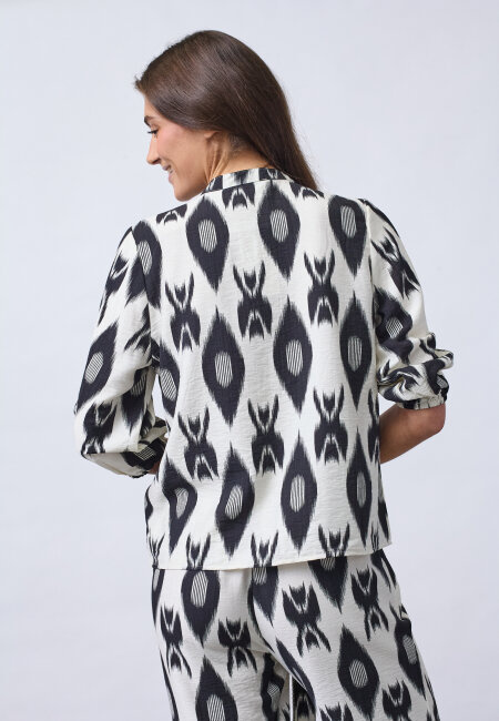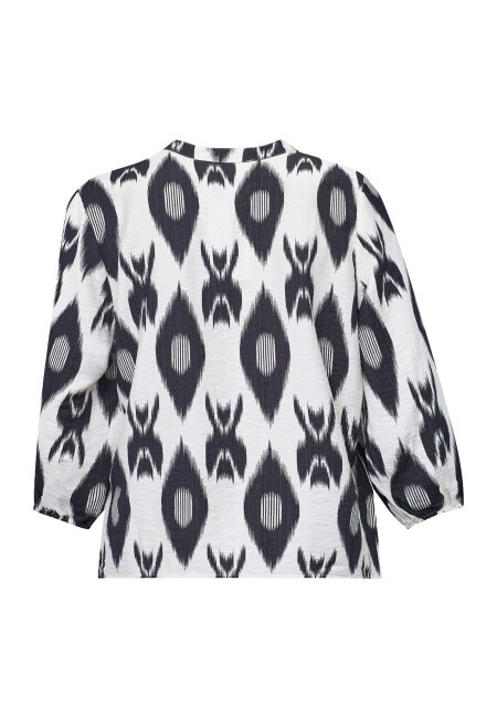 VIABA-SH7 is a shirt blouse with a distinctive, graphic ikat print. The blouse has a V-neck and a continuous button closure. The three-quarter-length sleeves have a puff effect and elasticated hem. The model is wearing a size S.
