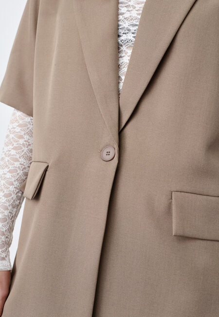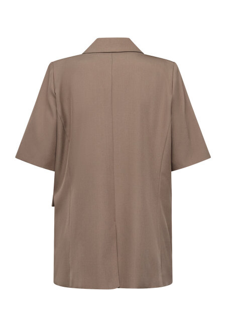 VIKSA-SS.BL is an oversized blazer with unique half-length sleeves and a sharp, tailored look. This short-sleeved blazer with a classic notch lapel, decorative flap pockets, and a single button closure. The model is wearing a size S.
