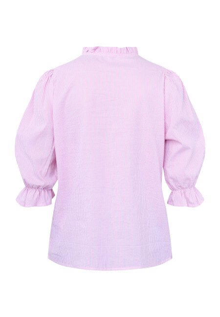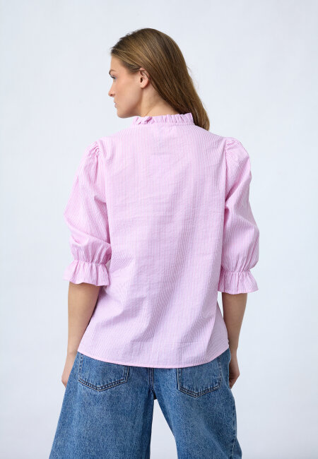 VYSLA-SS is a classic and timeless striped blouse with a modern twist. The blouse has a round neck with a small ruffle and short puff sleeves with cuffs. The model has a size S on.